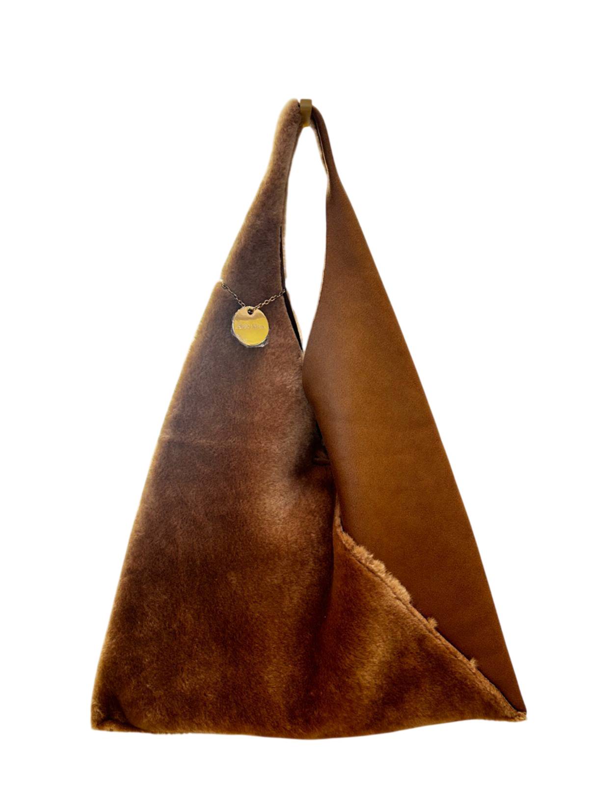Bolso marrón, estilo saco, combinando la antelina con pelo. Se cierra con clip en el centro e incluye una mini cartera en el interior.