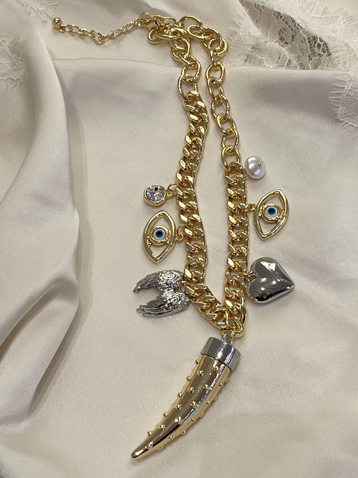 Collar combinado en plata y dorado con colgante ojo, alas, cuerno y perlas.