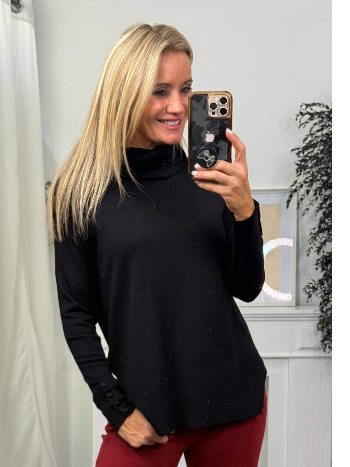 Jersey de punto fino de manga larga y cuello vuelto, con detalles de botones en del mismo color en los puños y abertura pequeña lateral. Composición: 80% viscosa, 20% nylon.