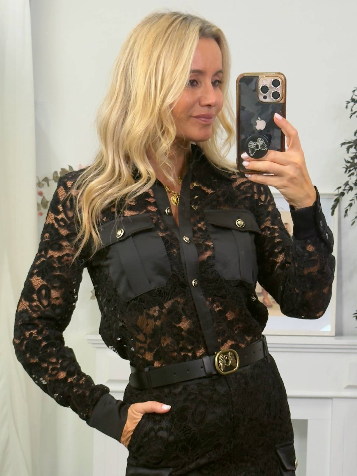 Camisa negra de encaje floral con detalles de satén, bolsillos y botones joya. Composición: 97% poliéster, 3% elastano