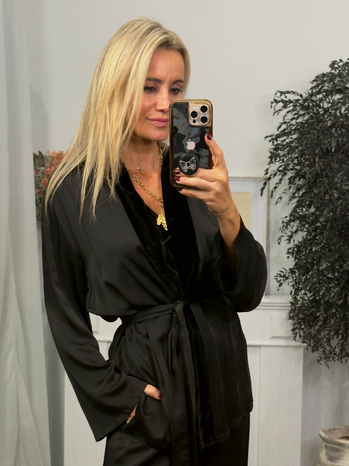 Cárdigan satinado en color negro con cuello en terciopelo sintético. Cinturón atado con lazada. Composición: 100% Viscosa