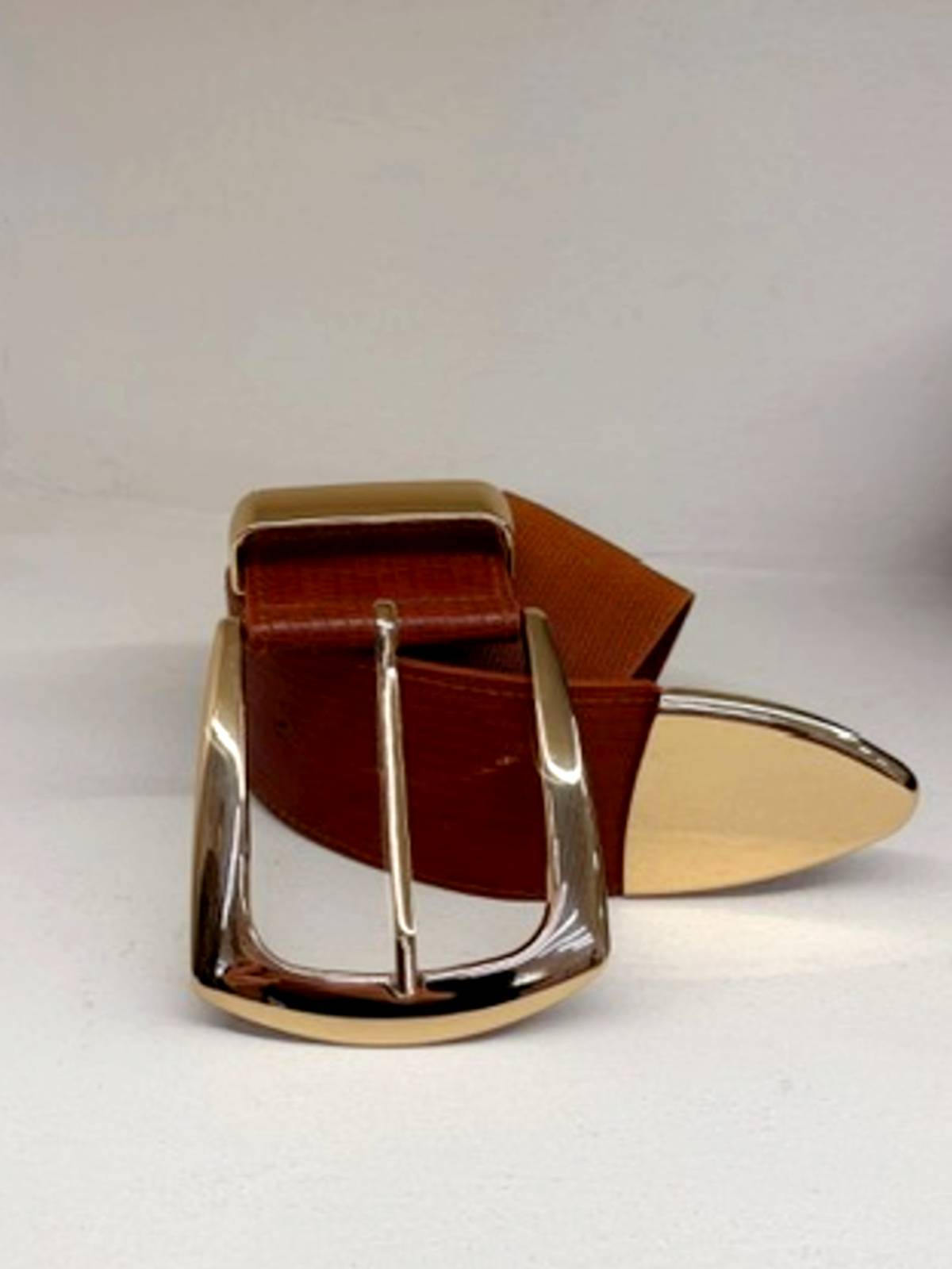 Cinturón elástico marrón combinado con ecopiel rugosa, con gran hebilla dorada.