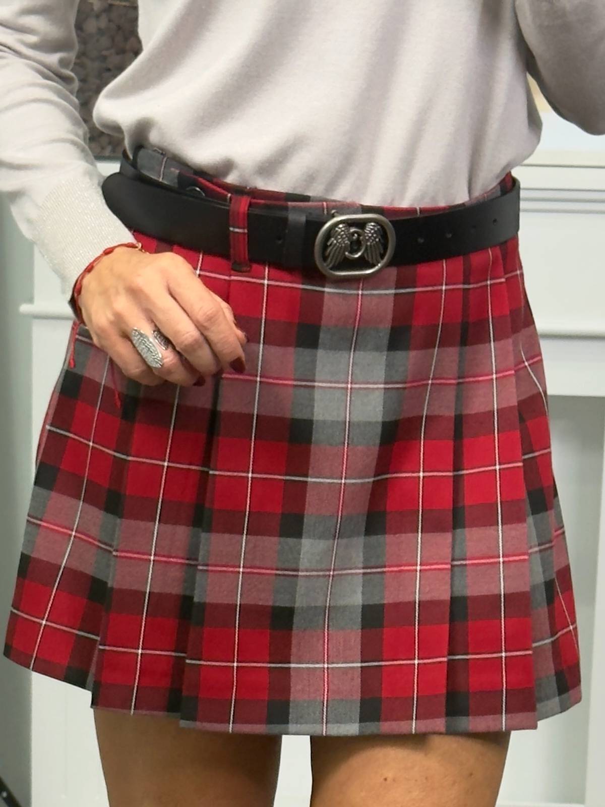 Falda pantalón de tablas, mini, con estampado de cuadros escoceses en color rojo, negro, blanco y gris. Cierre cruzado con botón lateral y trabillas. Cremallera invisible en uno de los laterales.