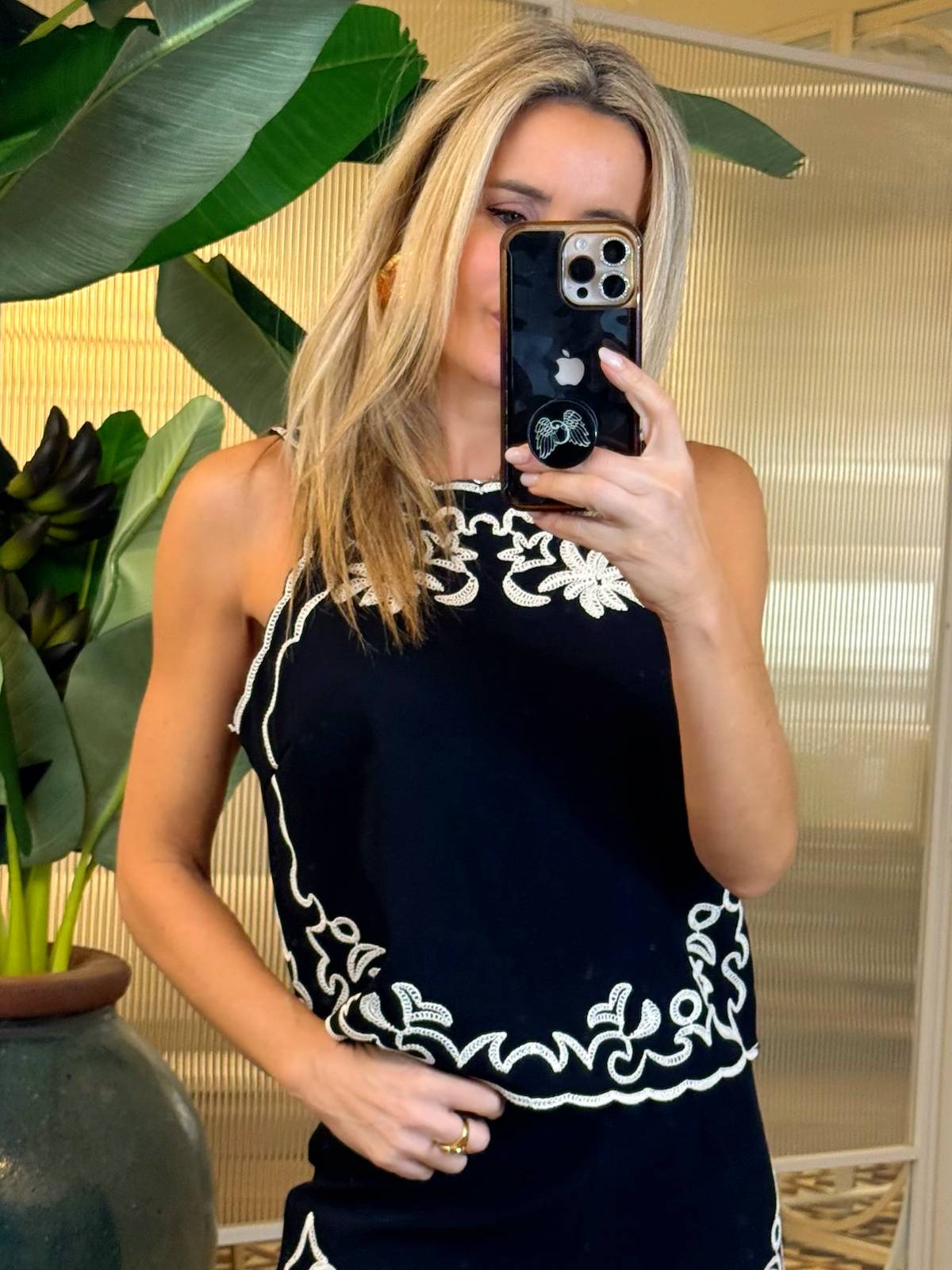 Top negro desmangado con escote halter con detalle de bordados en beige. Cierre de botón en en el cuello parte trasera. Composición: 95% poliéster, 5% spandex.