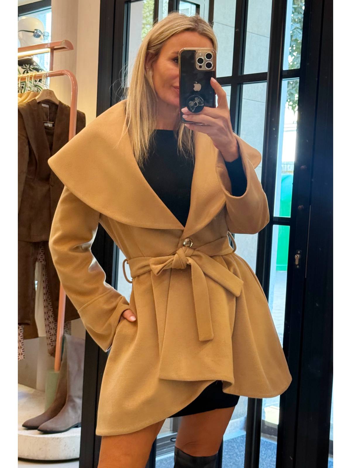 Abrigo de paño color camel. Cintura ajustada con parte inferior de vuelo. Cinturón atado con lazada. Cierre con botón dorado. Cuello con solapa ancha. Doble bolsillo. Composición: 92% Poliéster, 8%Viscosa.