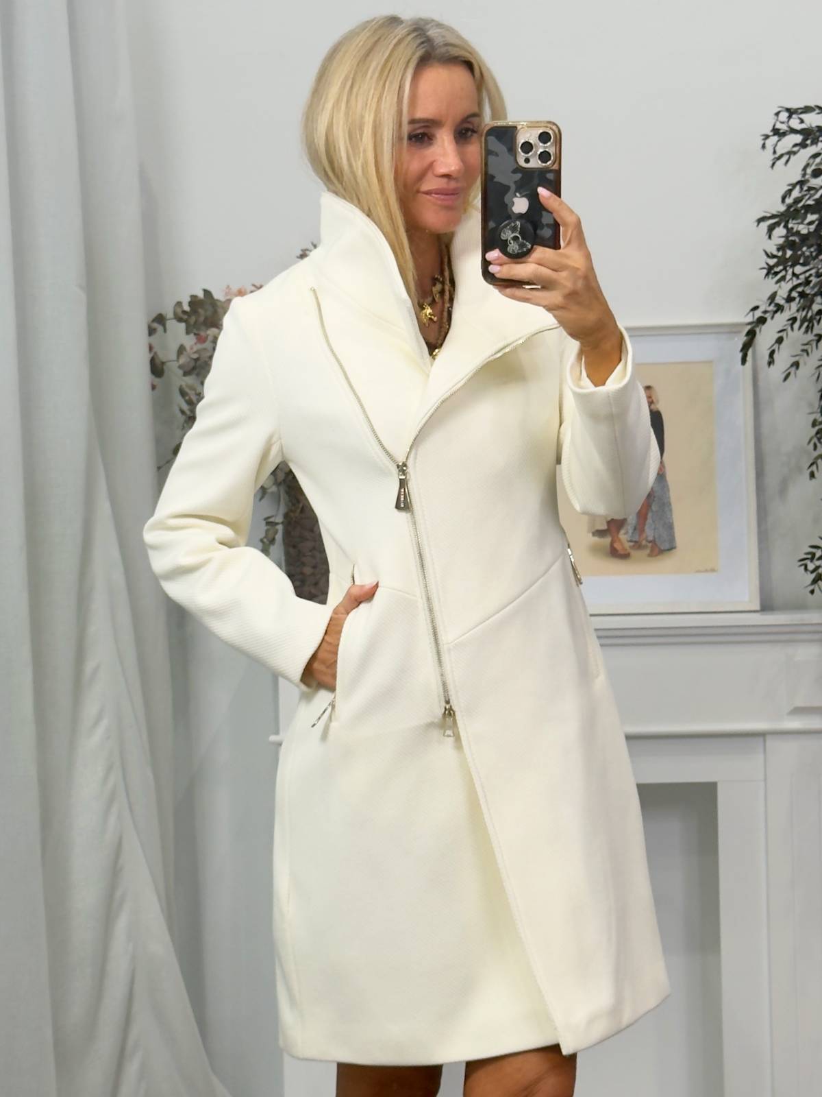 Abrigo de cuello alto con detalle de cremallera en diagonal en laparte delantera. Bolsillos laterales con cremalleras. Composición: 100% poliester.