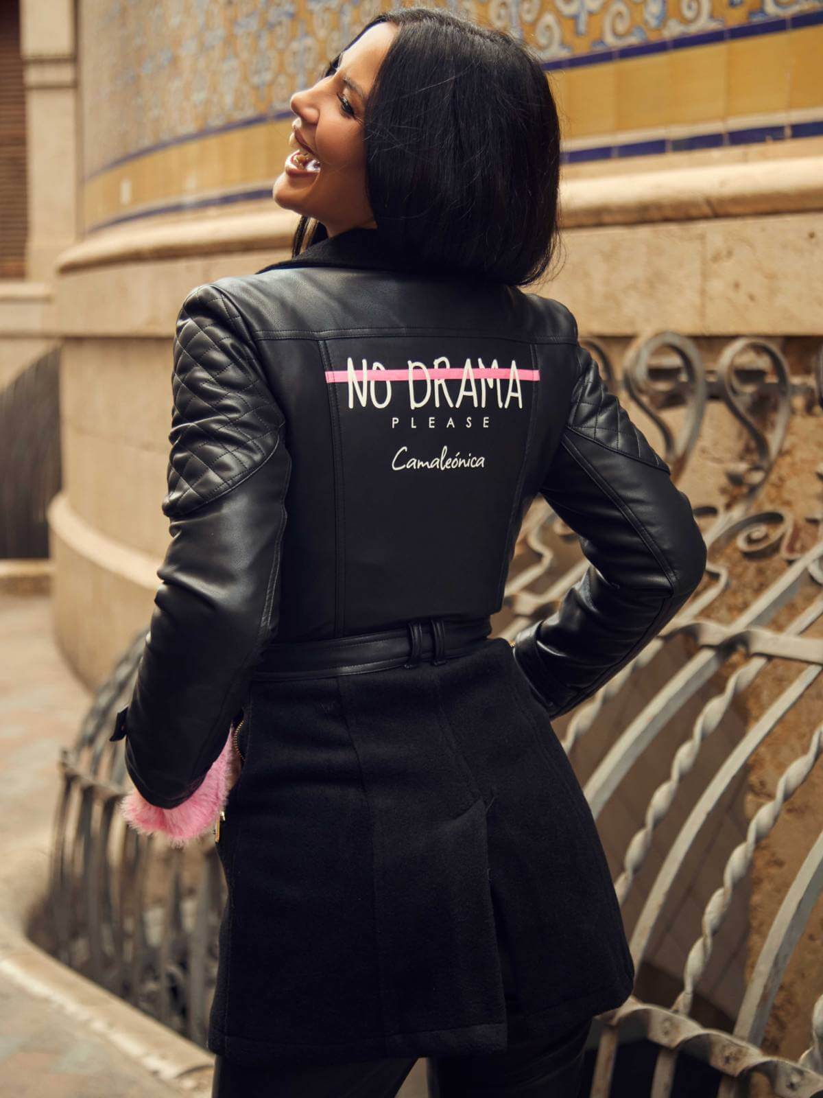 Abrigo negro con doble tejido. Parte superior tipo biker ecopiel con cierre de cremallera dorada cruzado con solapa. Cuello extraíble de borreguito. Detalles cremalleras en parte frontal superior. Cinturón regulable con hebilla logo de la marca dorado. Trabillas y cremalleras en puños. Mensaje en espalda 'No Drama' Camaleónica. Parte inferior de paño con bolsillos de ecopiel y detalles de botones en dorado.