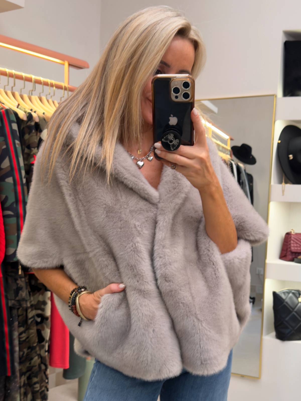 Abrigo de tejido con efecto piel sintética con mangas 3/4, capucha integrada, corte holgado tipo poncho cierre de botones invisible. Composición: 100% poliéster.