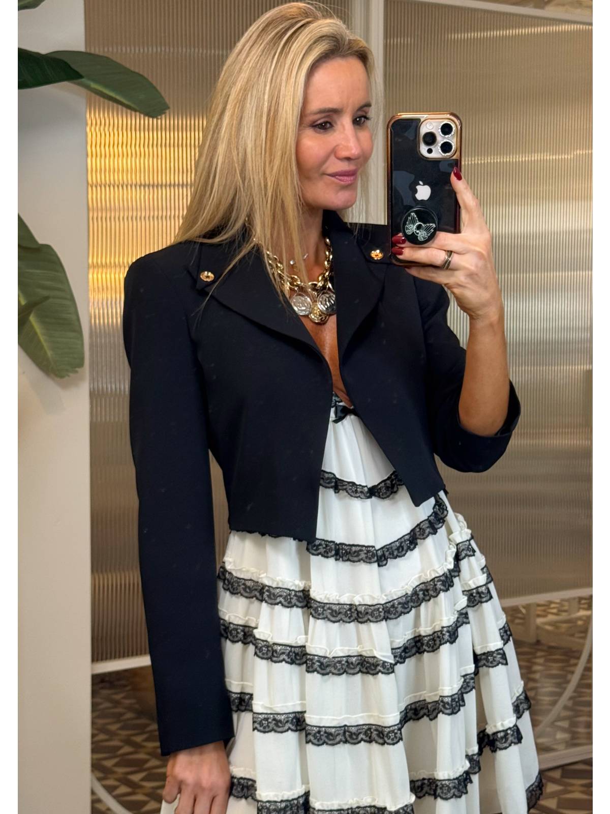 Blazer crop abierta con detalles botoens dorados en cuello y hombreras. Composición: 96% Poliéster, 4% Elastano