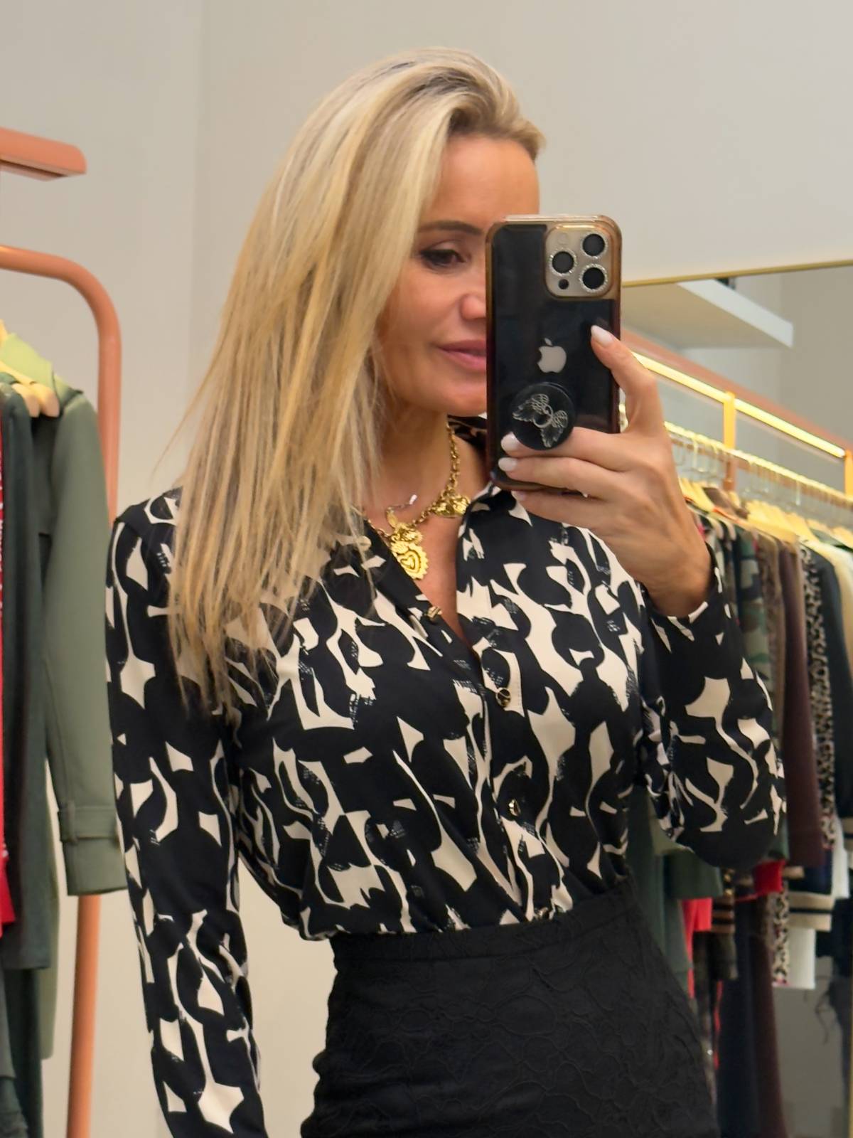 Camisa estampada abotonada con botones dorados. Composición: 65% poliéster, 30% viscosa, 5% elastano.