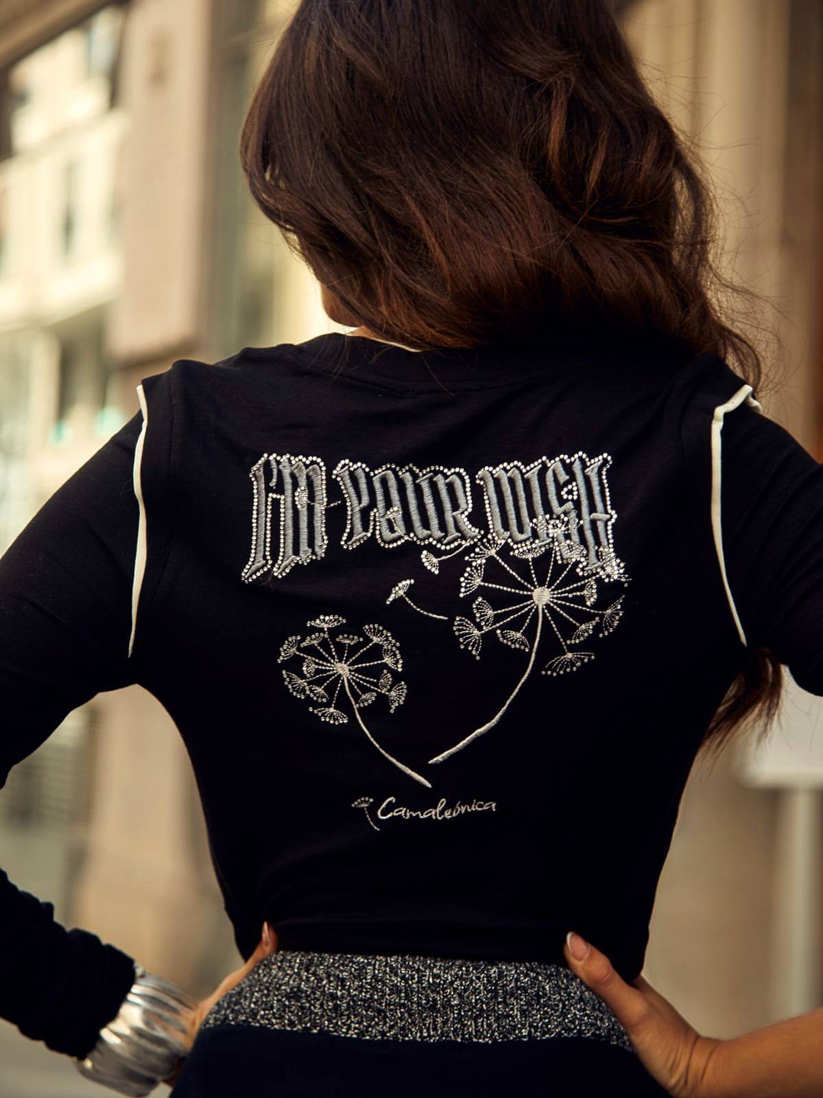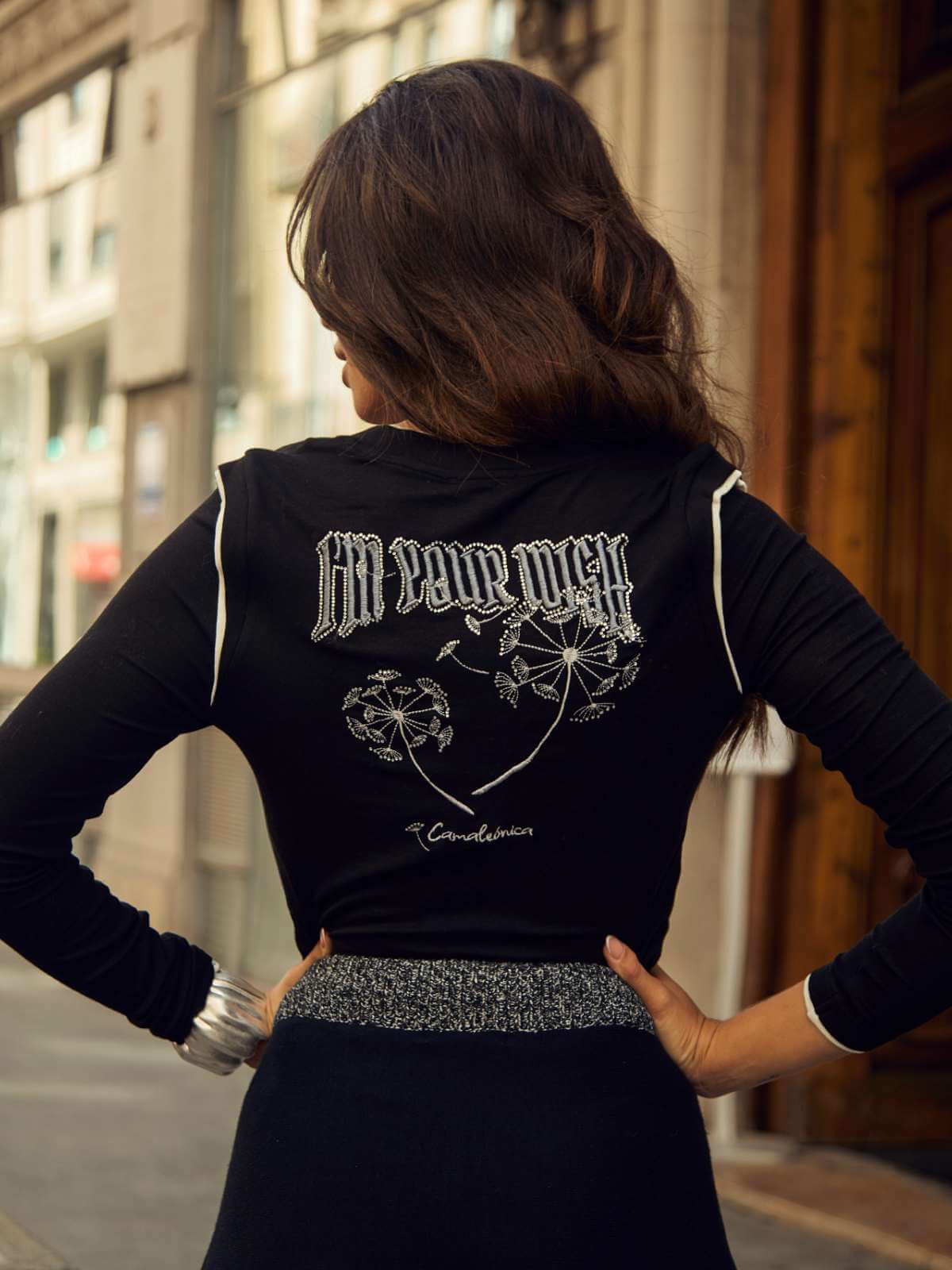 Camiseta de manga larga negra, con ribete en blanco en escote y manga. Cuello de pico y detalle de pequeño volante en el hombro. Bordado en la espalda en gris con frase de "Im your wish". Detalles de strass.