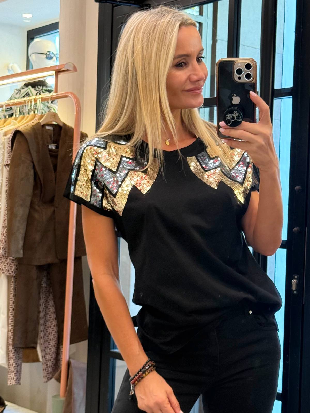Camiseta de algodón en color negro. Cuello redondo. Manga corta con detalle de lentejuelas doradas y plateadas. Composición: 100% Algodón.