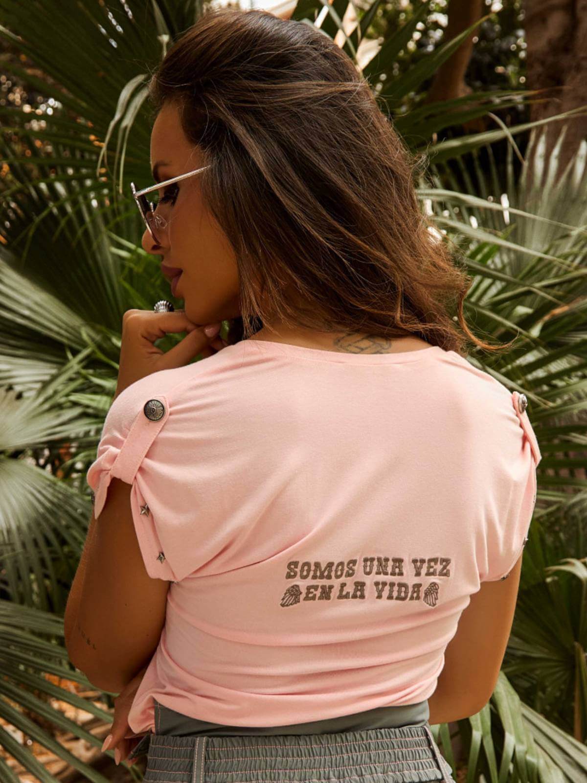 Camiseta rosa de manga corta caída, con escote de pico. Lleva bordado en la parte delantera y en la parte trasera. Las mangas van recogidas en el hombro con botón personalizado en níquel viejo, y la camiseta va decoradas con tachas en forma de estrella.