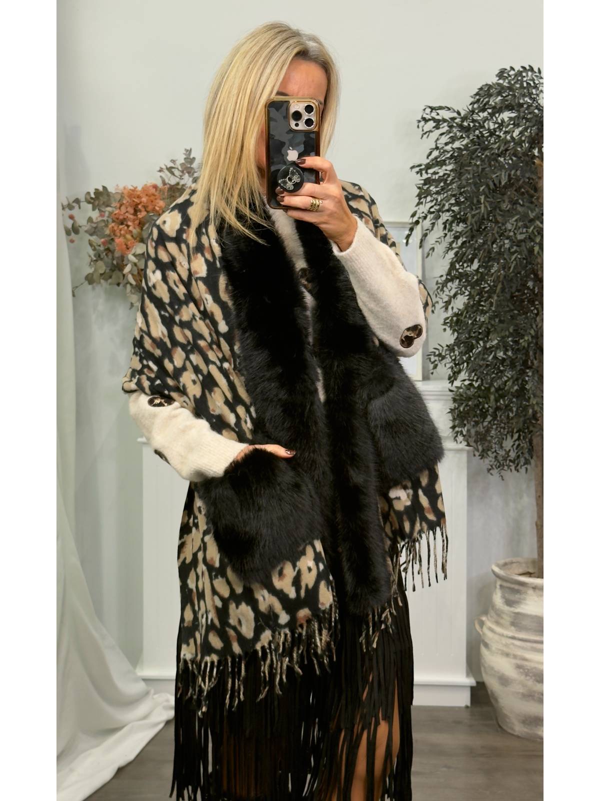 Capa estampado animal print con detalle de pelo en la parte del cuello y bolsillos. Composición: 100% poliéster