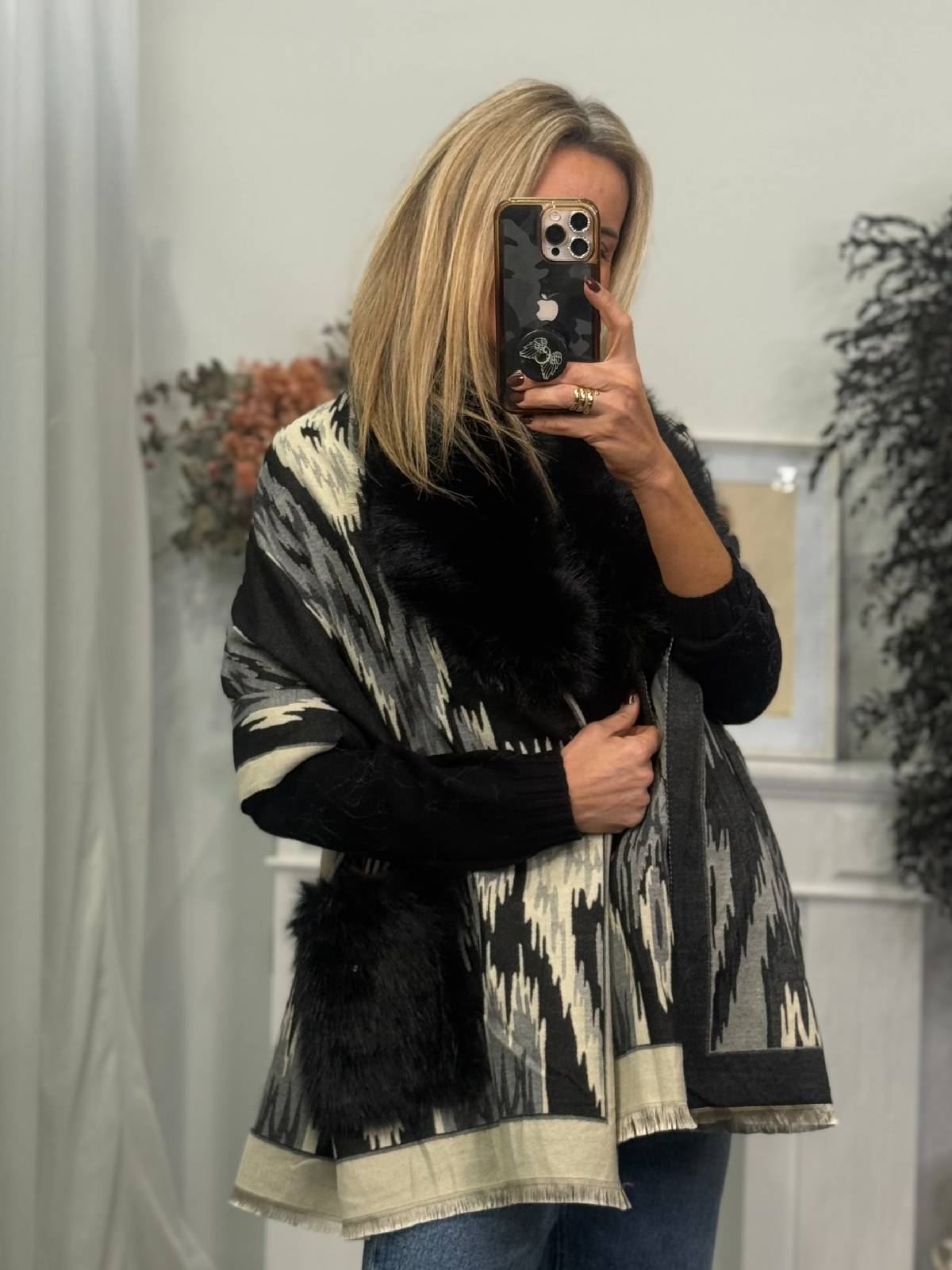 Capa con estampado étnico detalle de pelo en la parte del cuello y bolsillos. Composición: 100% poliéster