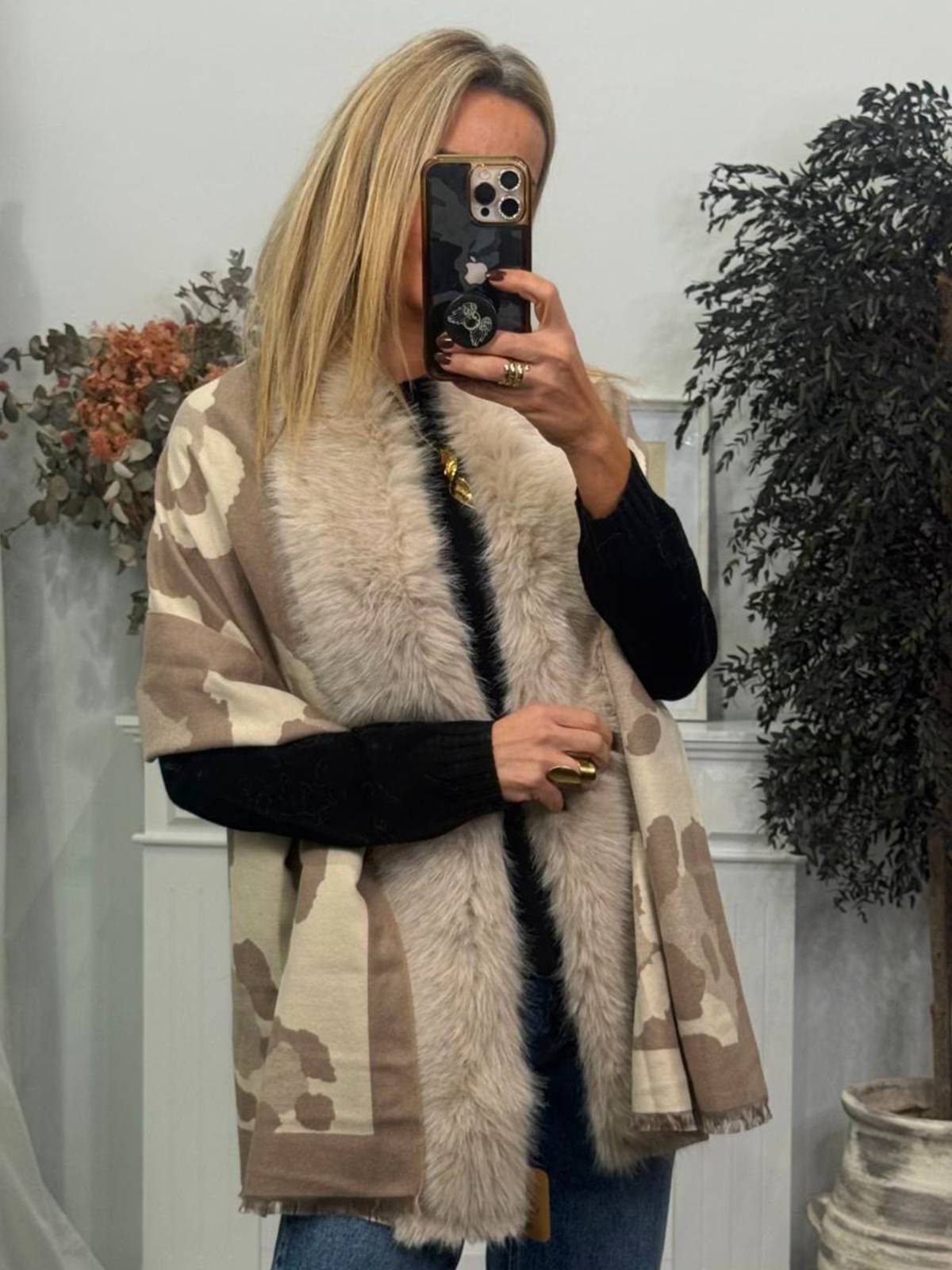 Capa estampana animal print beige con detalle de pelo en la parte del cuello y bolsillos. Composición: 100% poliéster
