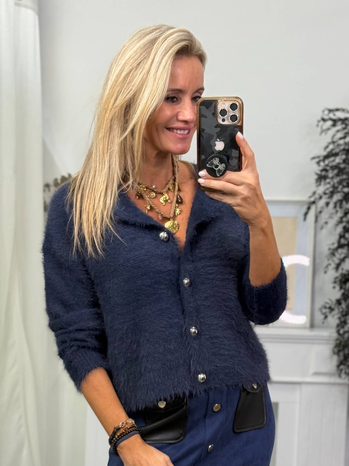 Cárdigan de pelo sintético con cuello redondo con cierre botones metalizados. Composición: 68% Poliamida, 32% Acrílico.