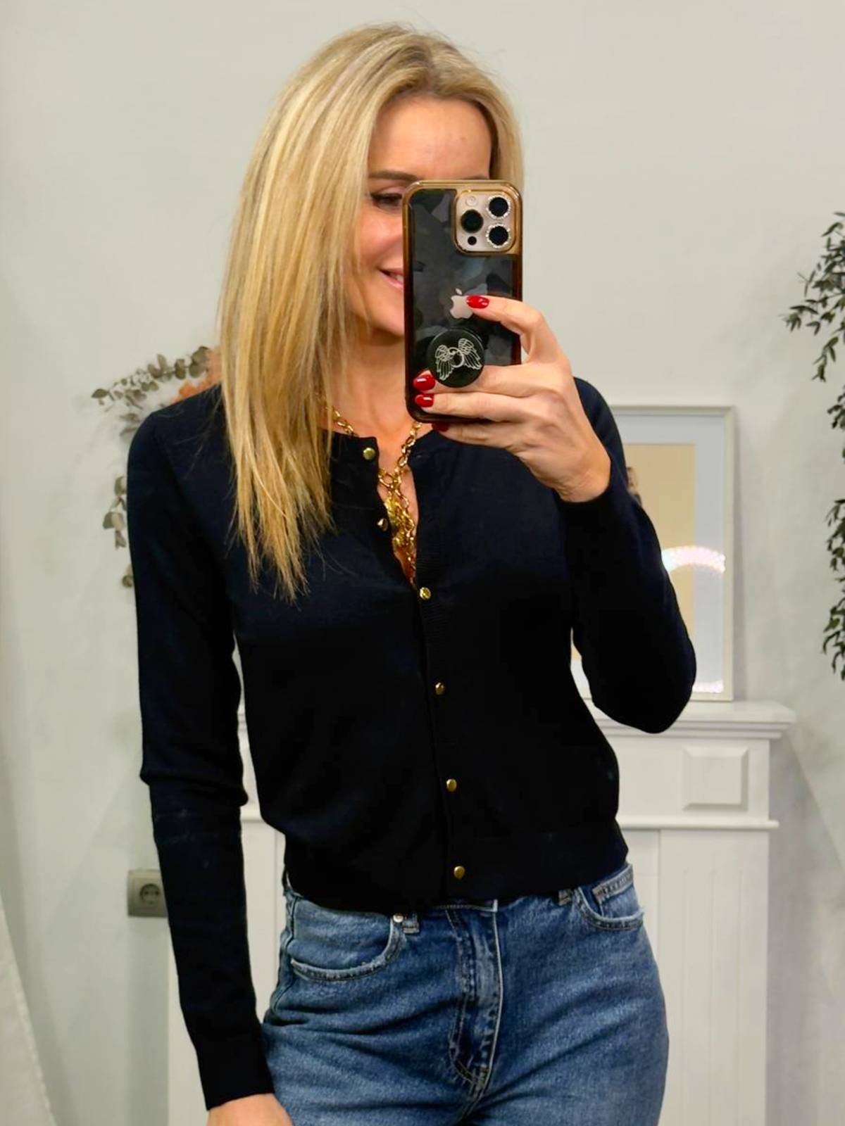 Cárdigan de punto azul marino con botones dorados. Cuello redondo. Composición: 70% Viscosa, 30% Poliamida.