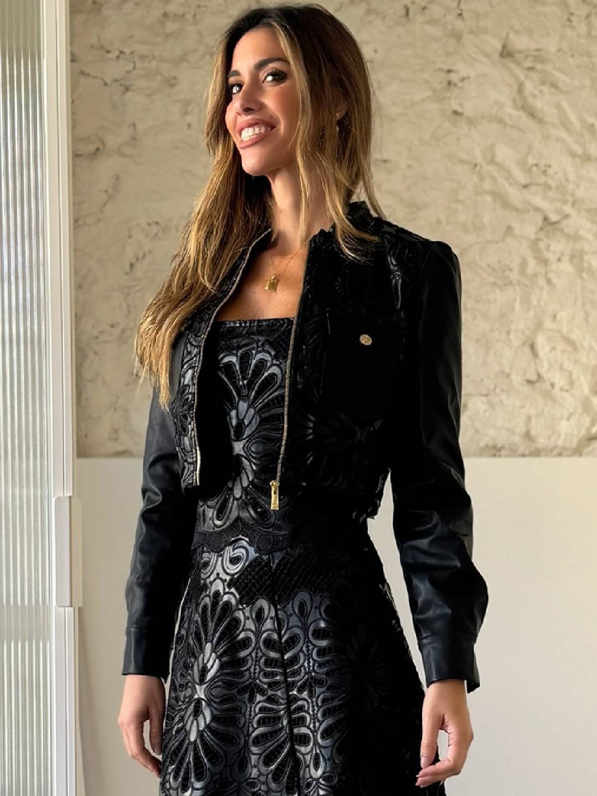 Cazadora de ecopiel negra corta, de manga larga con cuello mao. Detalle de encaje de guipur parte delantera y trasera. Dos bolsillos delanteros. Cierre central de cremallera en dorado.