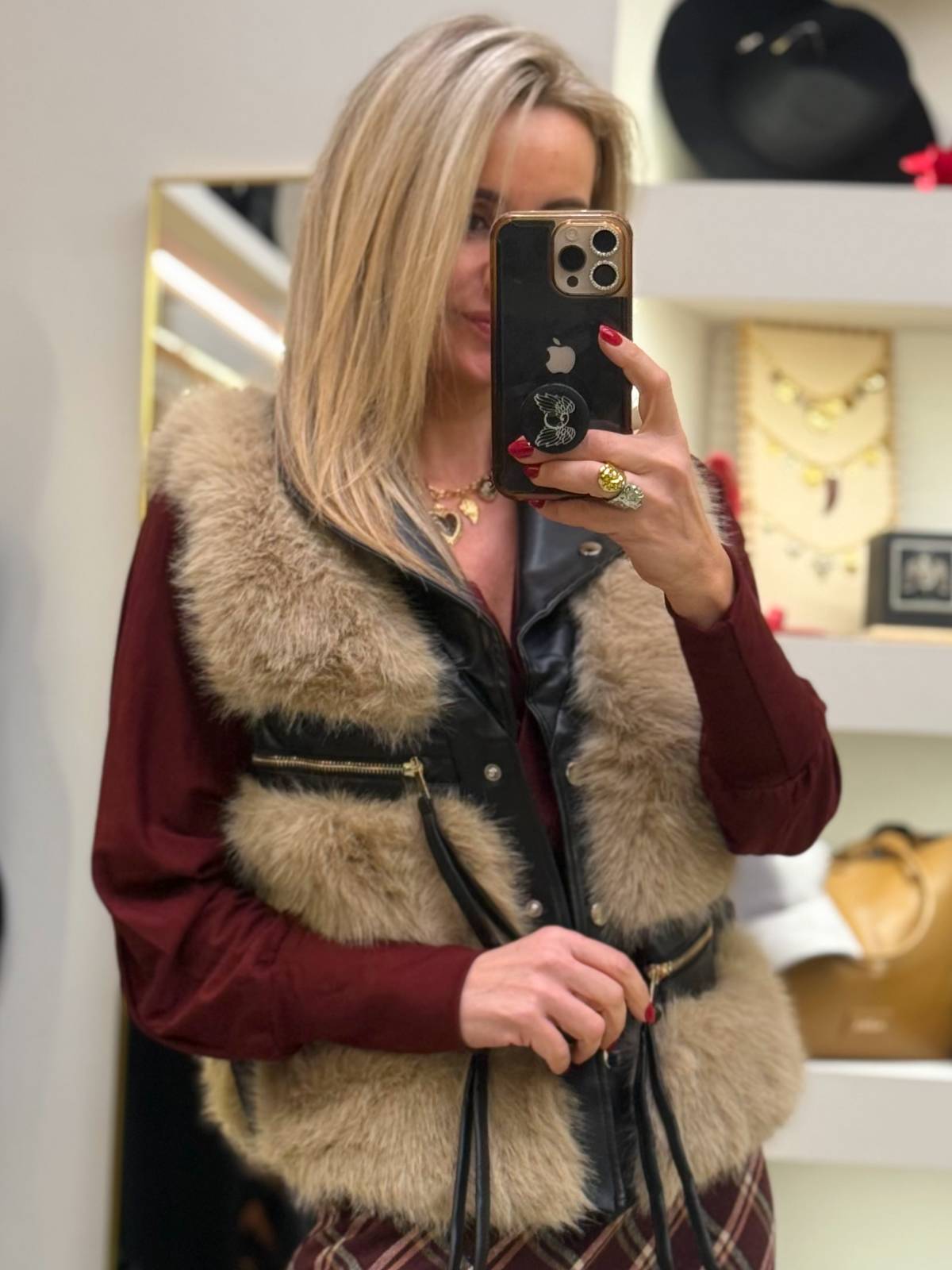 Chaleco de ecopiel combinado con pelo. Escote en pico y abotonado en la parte central y detalles de cremalleras. Composición: 100% poliéster.