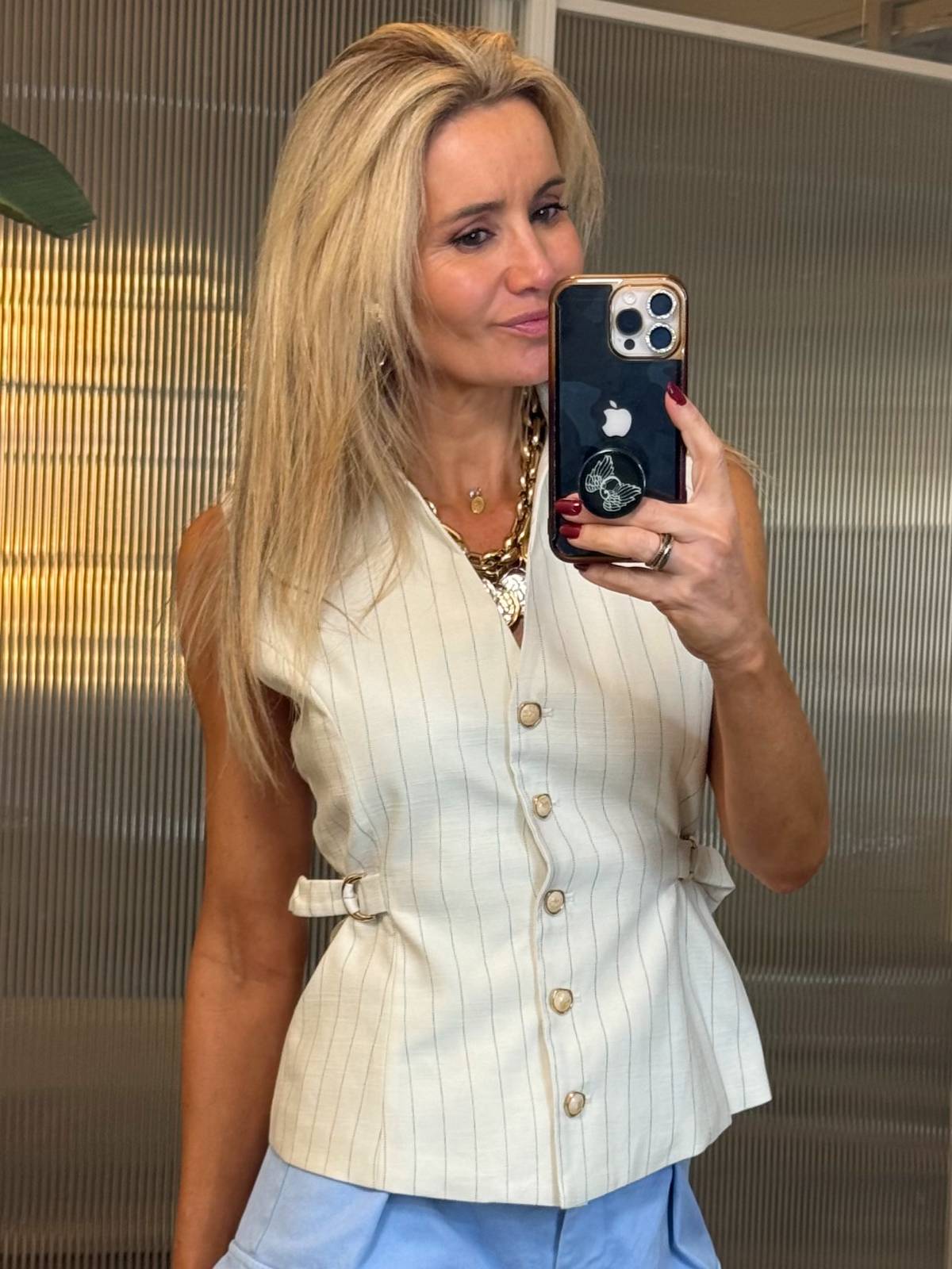 Chaleco beige con estampado de raya diplomática estilo camisa, con escote en pico y abotonado en la parte delantera. Detale de trabillas laterales. Composición: 92% viscosa, 8% poliéster.