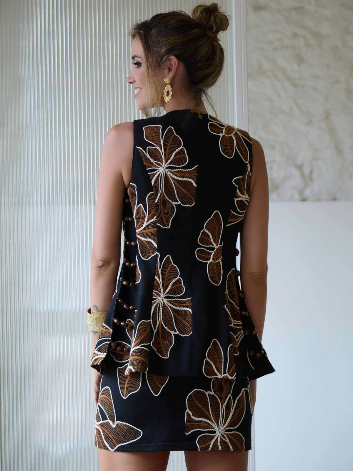 Chaleco negro con flores grandes bordadas en hilo trenzado beige e hilo en color caldera. Escote en pico, abotonado hasta el bajo. Los laterales del chaleco van abiertos con tiras decoradas con abalorios. La espalda va cerrada y lleva la chapa de Camaleónica en oro viejo.