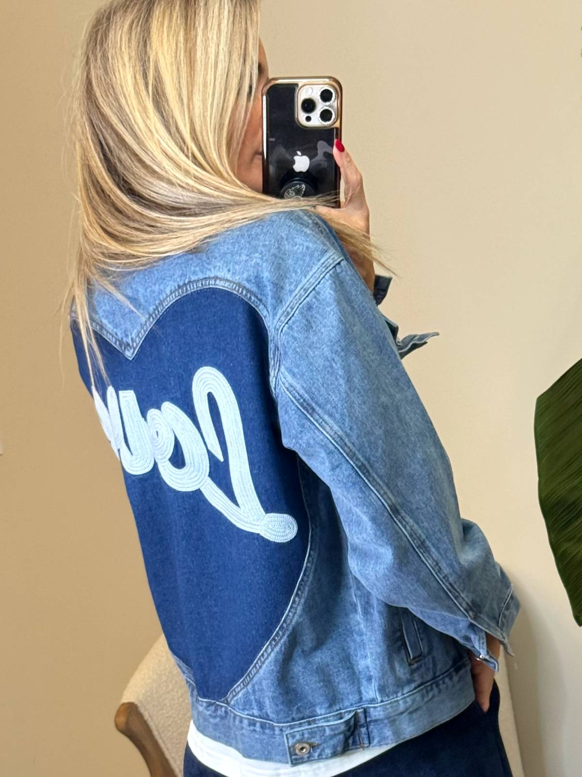 Chaqueta vaquera oversize de manga larga abotonada en la parte delantera. Detalle de corazón y bordado en la espalda. Bolsillos frontales y laterales. Composición: 80% algodón. 18% poliéster, 2% elastán.