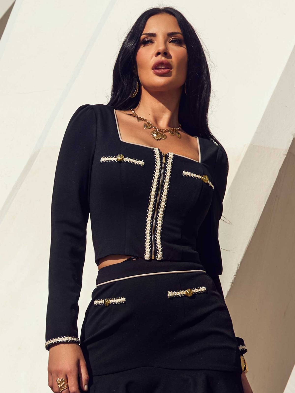 Chaqueta en color negro corta con detalles blancos. Escote cuadrado Falso bolsillos franceses en frontal color blanco con detalle de botón dorado. Cremallera central dorada.