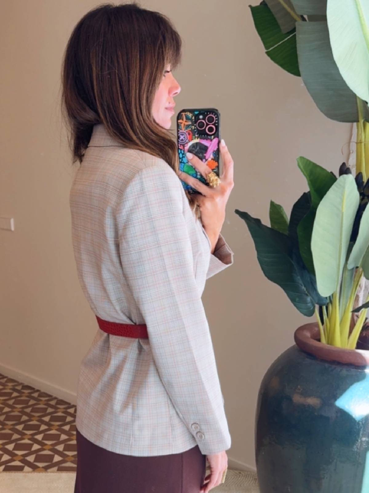 Chaqueta estilo americana cruzada con botones, en color beige, con estampado de cuadros. Cinturón de piel de serpiente sintética en color rojo con hebilla dorada. Hombreras. Solapas en frontal. Botones en puños. Hilo brillante. Composición: 80% Poliéster, 2% Elastano, 18% Viscosa