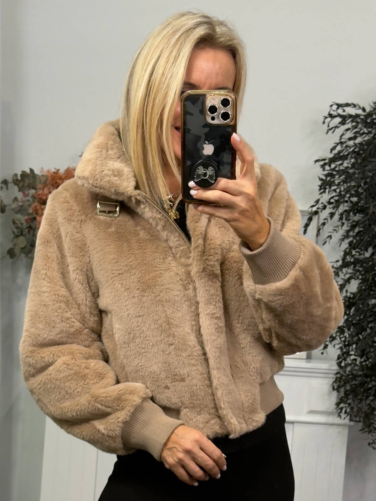 Chaqueta de pelo sintético color camel, con trabilla en cuello. Cierre central con botones y cremallera. Puños y bajo canalé. Doble bolsillo frontal. Composición: 100% poliéster.