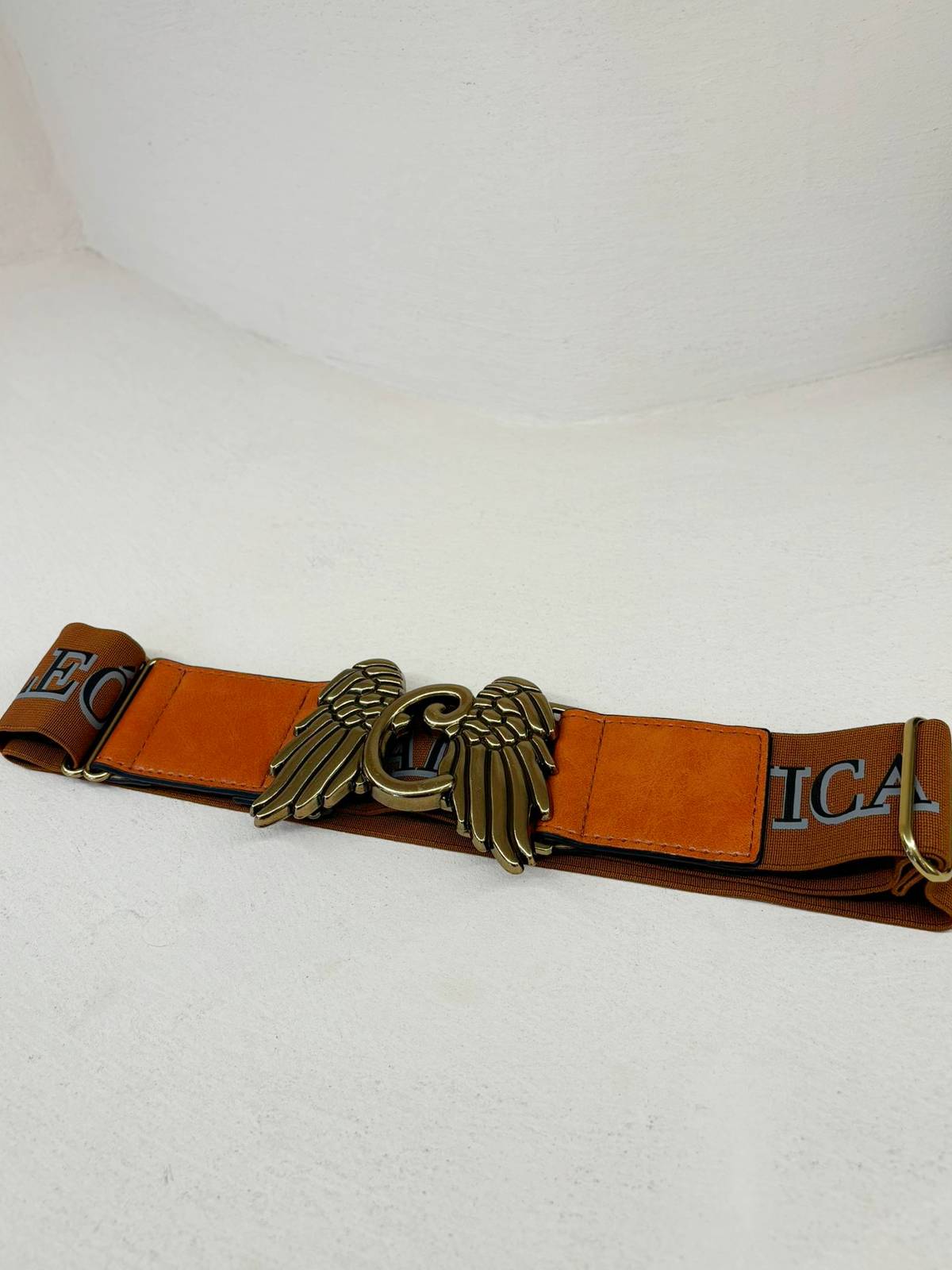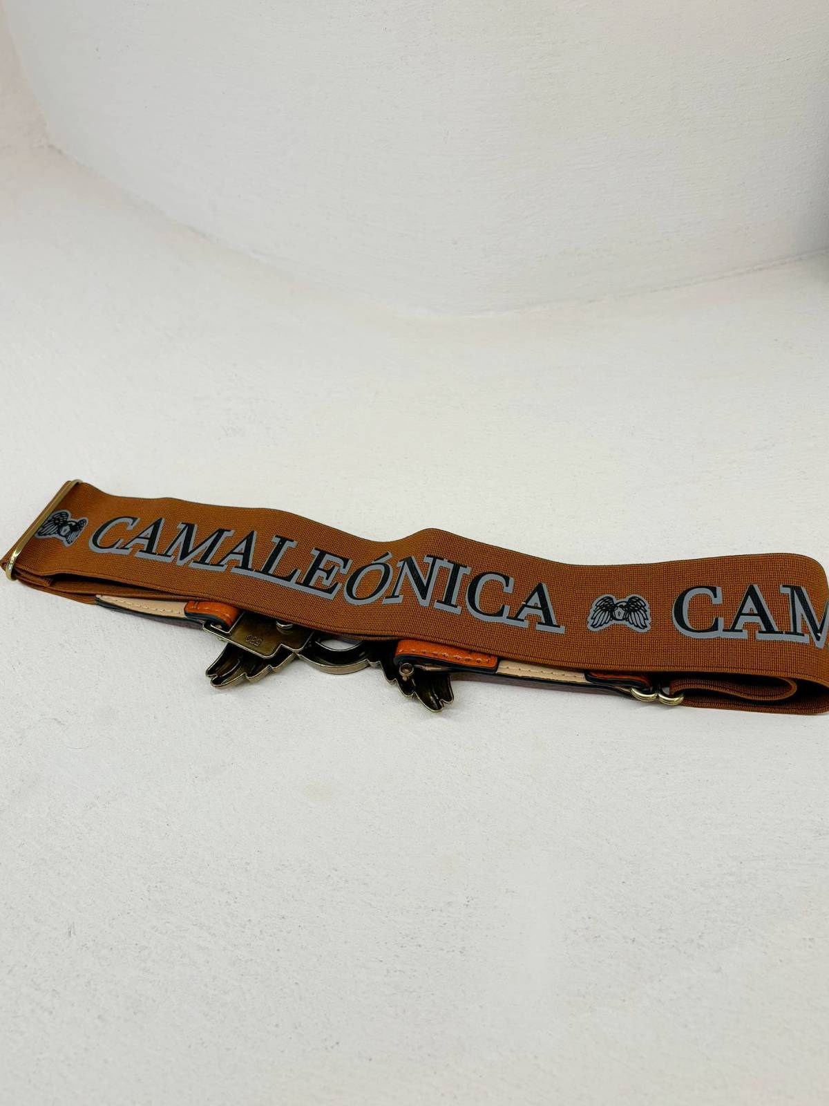 Cinturón marrón con la palabra Camaleónica en plata metalizada y hebilla en metalizada en color dorado.