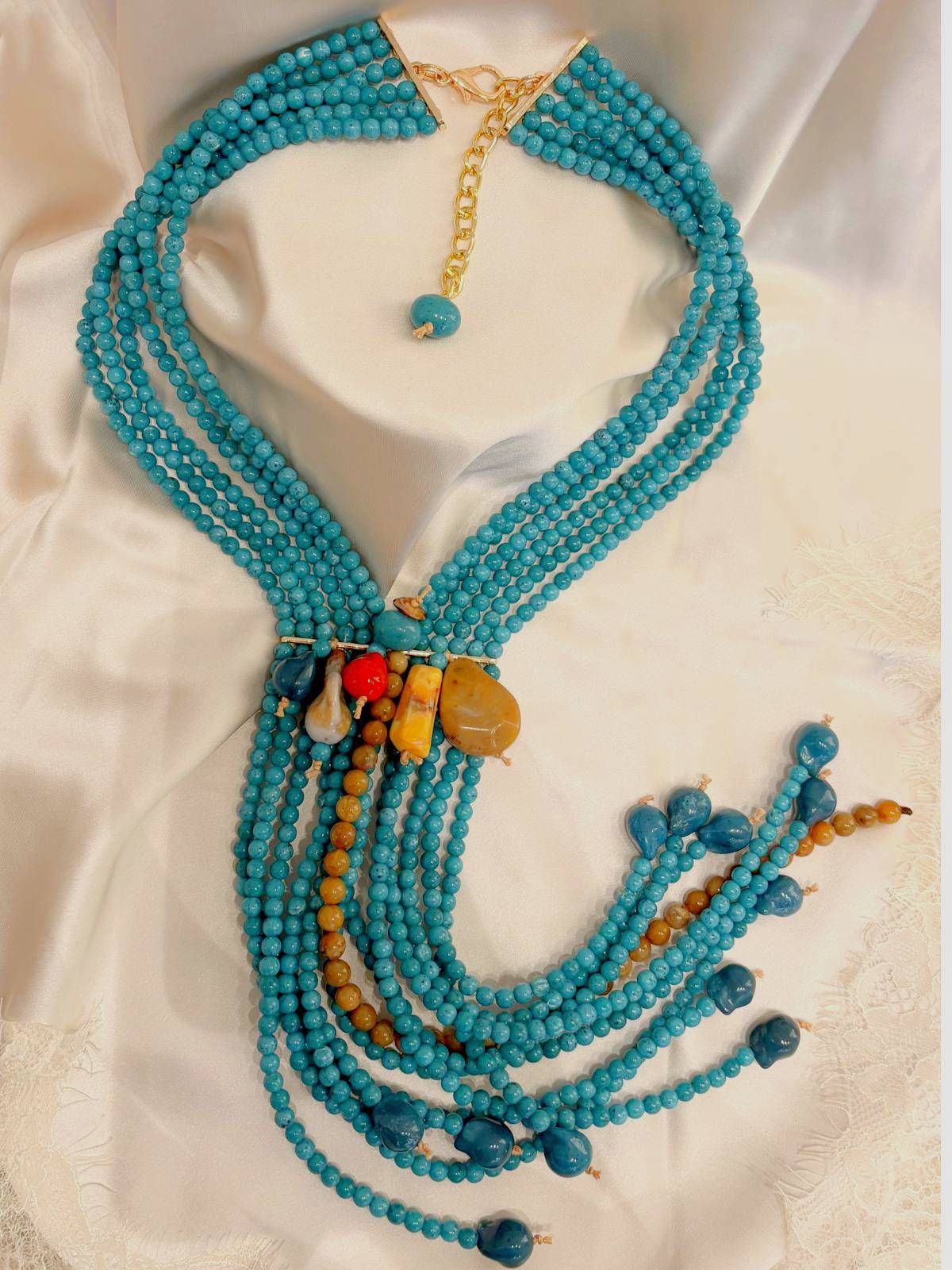 Collar múltiple de cuentas azules con broche dorado. Detalle piedras de colores.