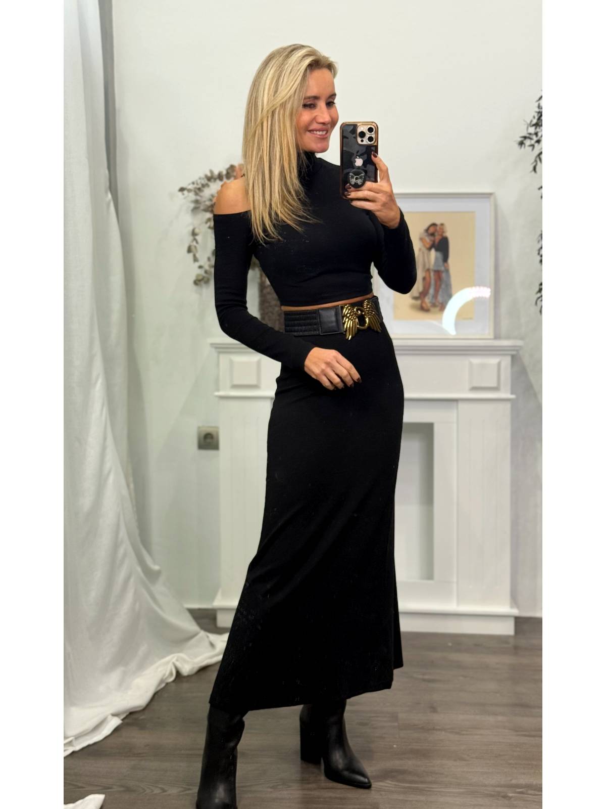 Conjunto de dos piezas compuesto por top y falda de algodón unicolor. Top con cuello alto y abertura en hombro. Falda larga con goma en cintura. Composición: 90% Algodón,10% Elastano
