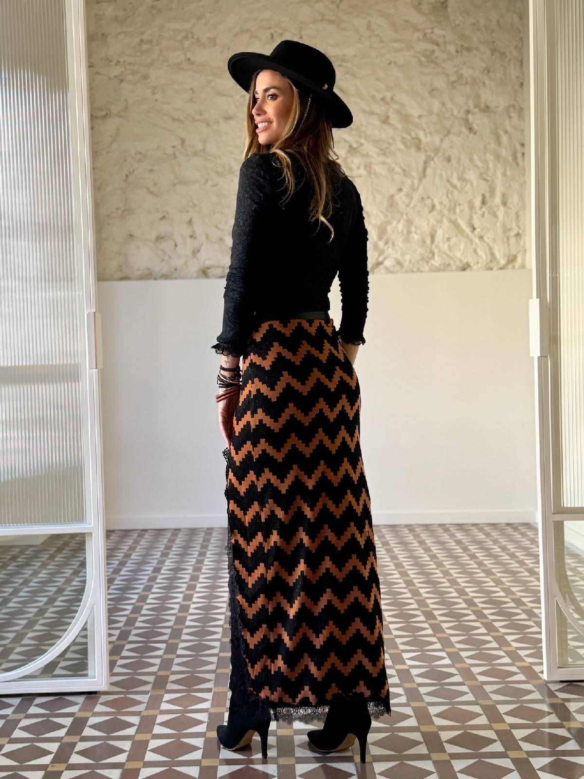 Falda larga con estampado geométrico color teja y negro con detalles de purpurina. Abertura lateral y bajo con detalle de puntilla. Cintura de ecopiel negra. Cremallera invisible lateral.