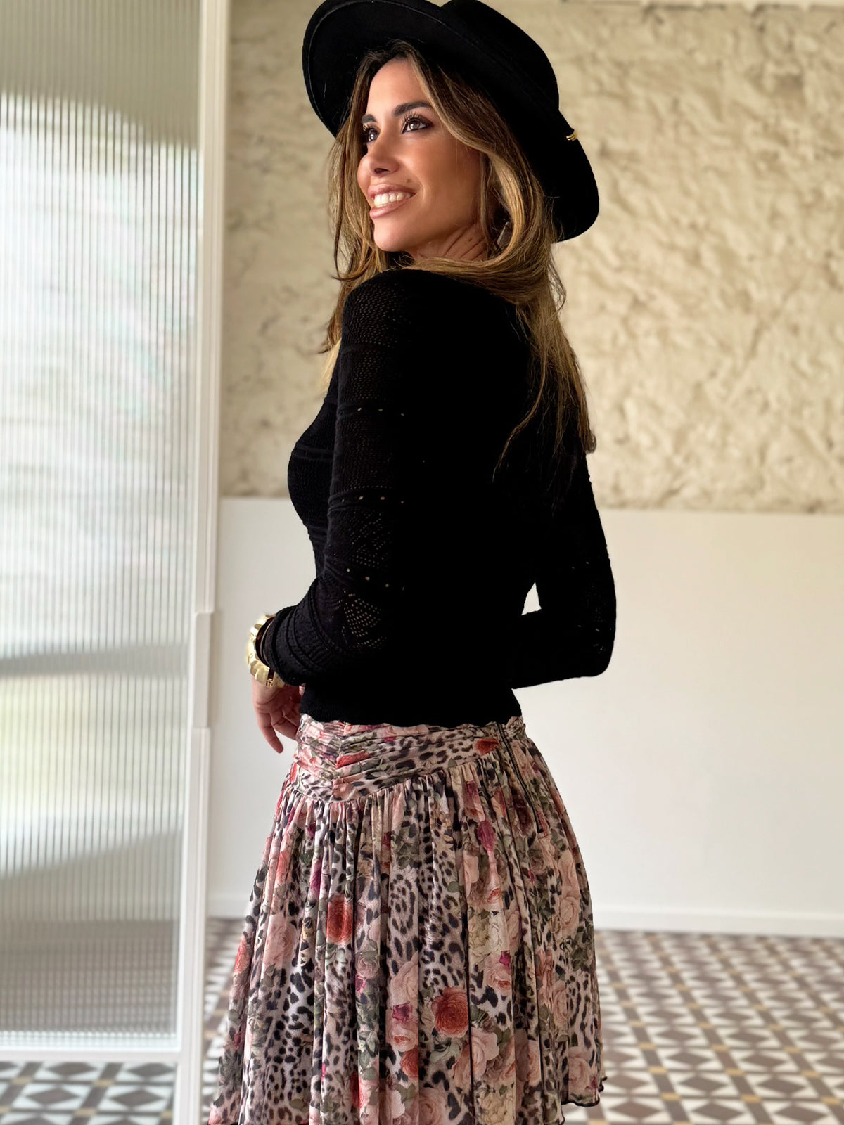 Falda corta fluida, en tejido de tul con estampado combinado de flores en colores rosas, verdes y marrones, con animal print. Lleva detalle fruncido en la parte de la cinturilla. Se cierra con cremallera dorada personalizada en la parte trasera.