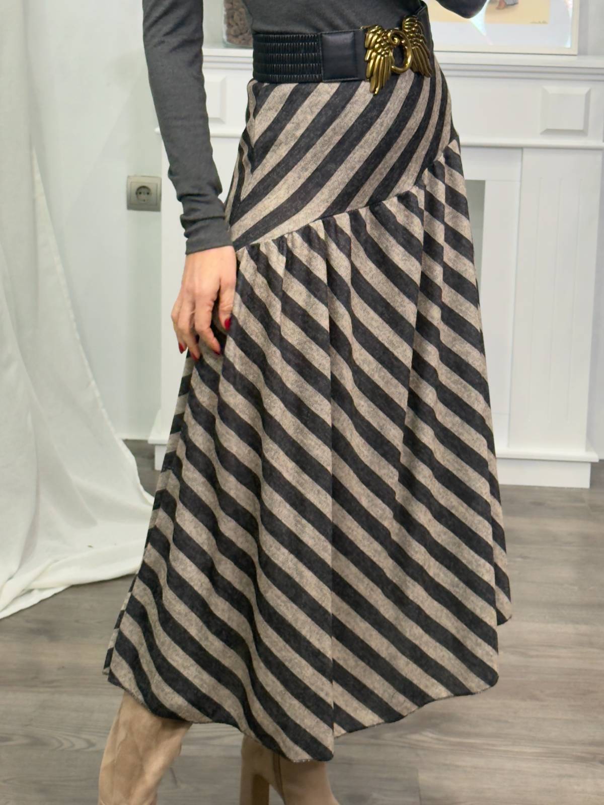 Falda larga con estampado a rayas asimétricas. Cintura elástica. Composición: 90% poliéster, 8% viscosa, 2% elastán.