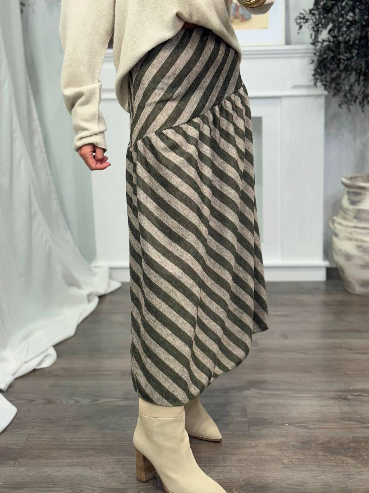 Falda larga con estampado a rayas asimétricas. Cintura elástica. Composición: 90% poliéster, 8% viscosa, 2% elastán.
