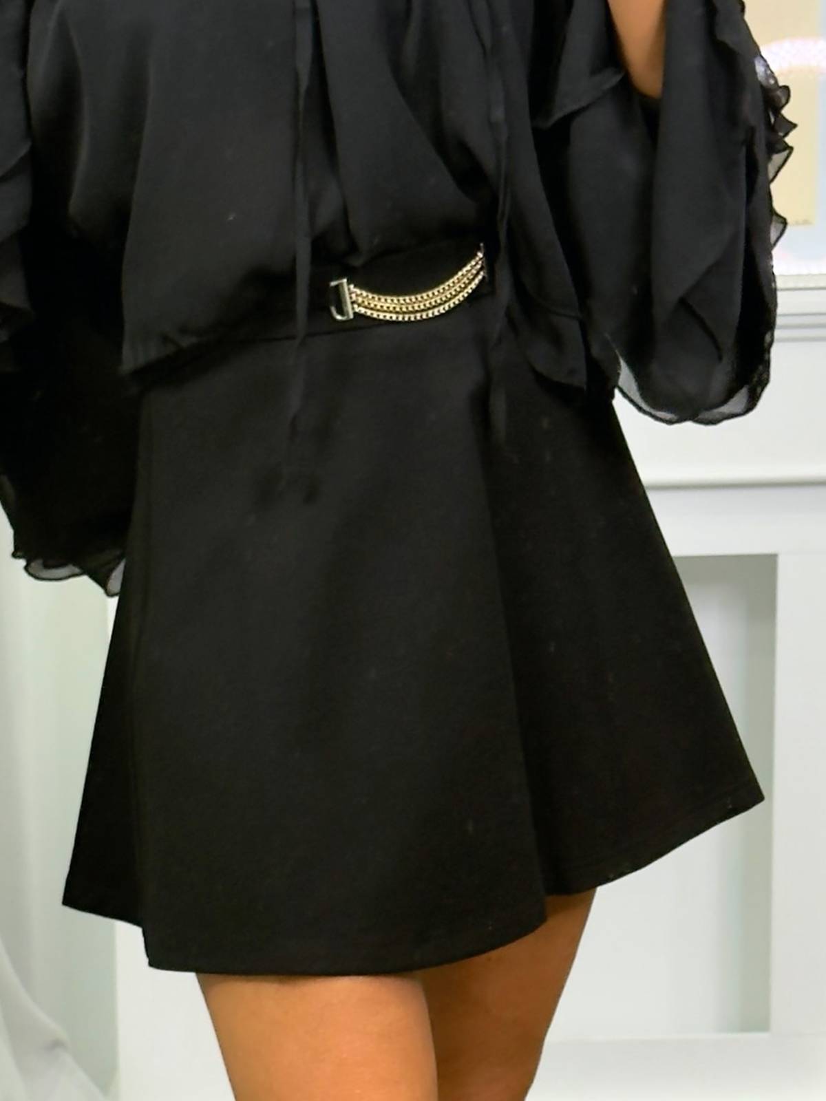 Falda corta negra efecto tableado con detalle de trozo de cadenas dorada en la cintura. Cremallera invisible lateral. Composición: 72% viscosa, 23% nylon, 5% elastán.