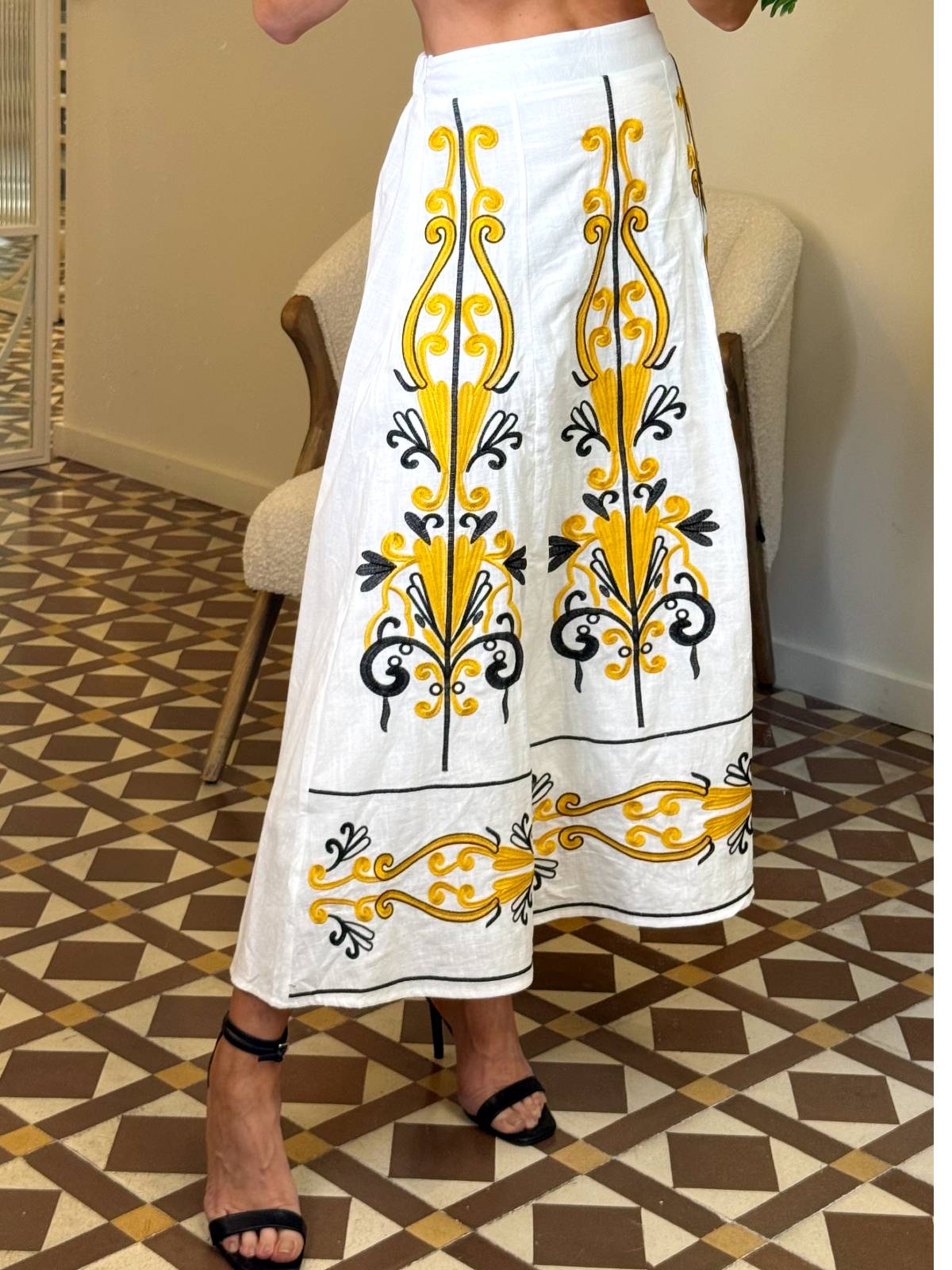 Falda blanca, larga, fluida con detalles bordados en la parte delantera en color amarillo y negro. Lleva goma en la cintura y se cierra con cremallera invisible en la parte trasera. Composición: 100%algodón.