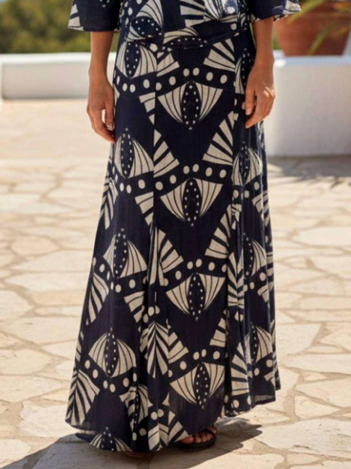 Falda larga de vuelo con estampado florar en marino y blanco, con cintura elástica en la parte trasera de nido de abeja y volantes en bajo. Composición: 100% rayón