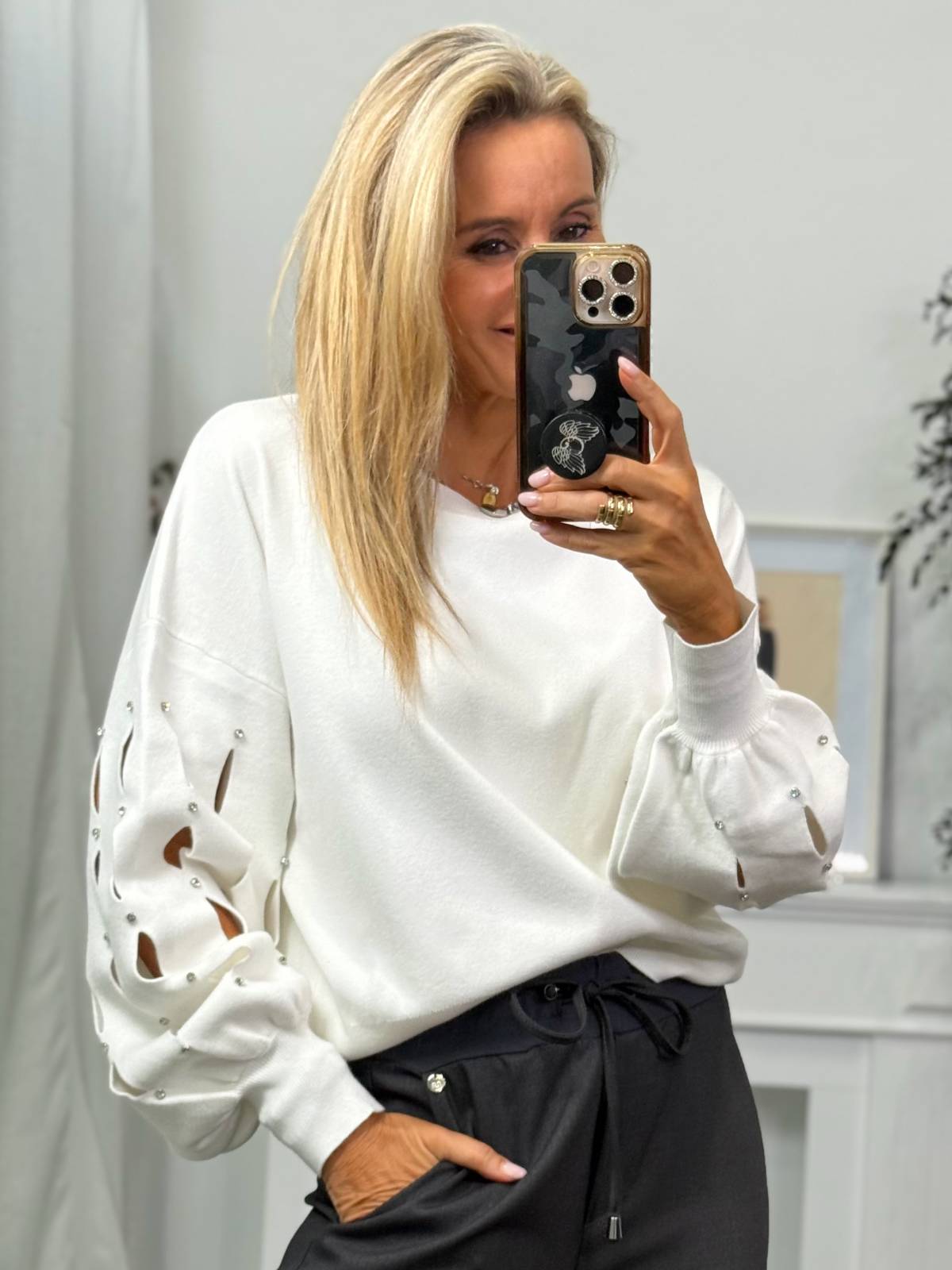 Jersey ded punto con mangas abullonadas con aberutas y detalles de brillos. Cuello redondo. Canalé en cuello y puños. Composición: 48% Viscosa,28% Poliéster, 24% Nylon