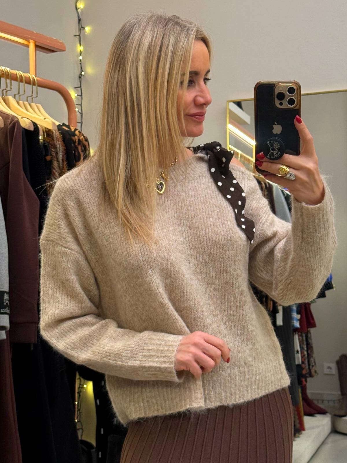 Jersey de punto beige, de cuello cerrado con lazada en marrón y lunares blancos, con abertura en el hombro. Composición: 55% poliéster, 30% poliamida, 13% lana, 2% elastán.