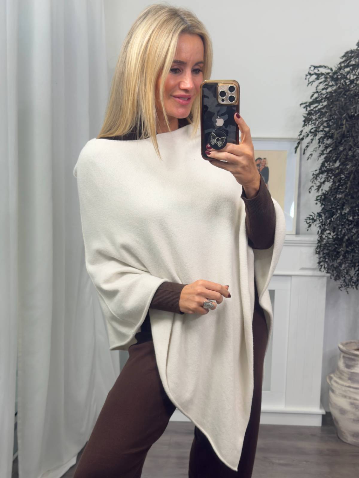 Jersey tipo poncho de punto, con acabado en pico y cuello redondo. Bordes sin costuras. Composición: 52% Viscosa, 26% Poliéster, 22% Poliamida.