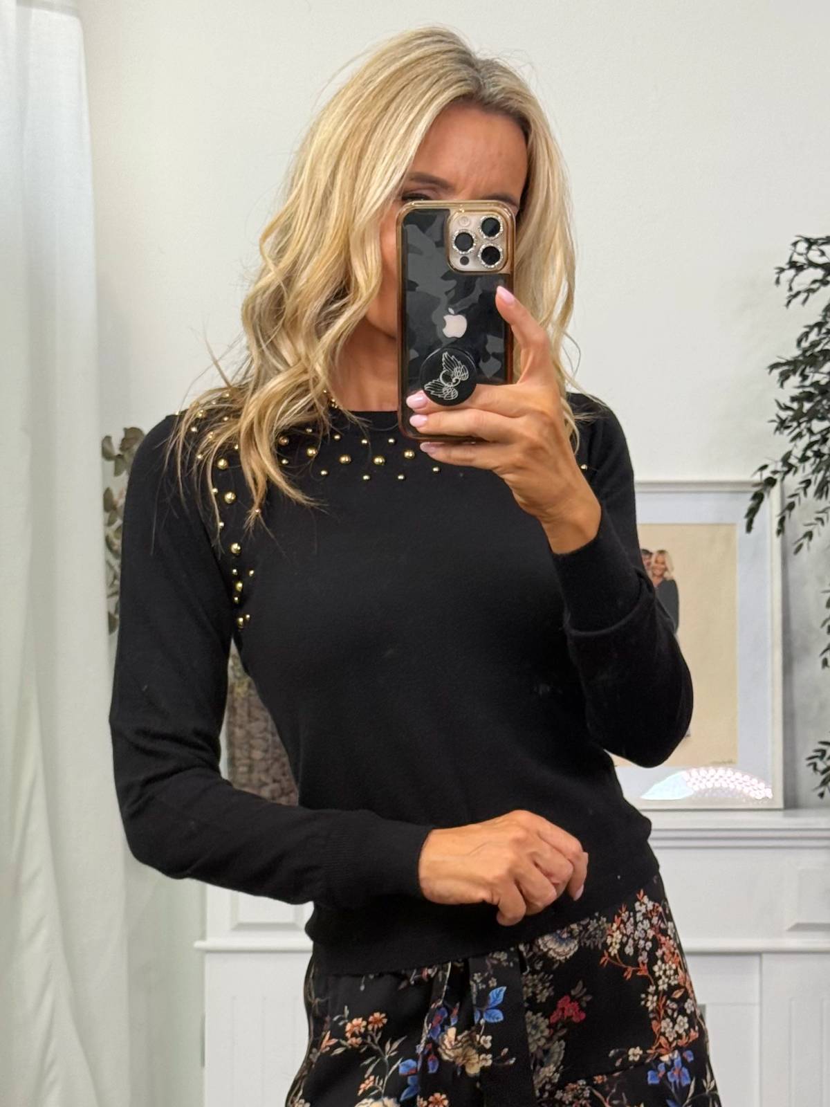 Jersey negro de punto, manga larga, cuello cerrado con tachuelas en dorado en la parte del cuello. Composición: 50% viscosa, 30% poliester, 20% poliamida.