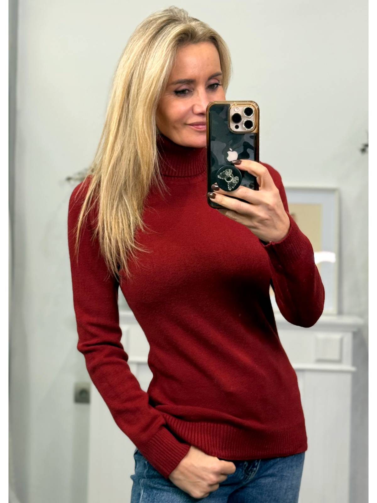 Jersey entallado de cuello alto, con puño y bajo entallado. Composición: 35% modal, 20% nylon, 5% lana