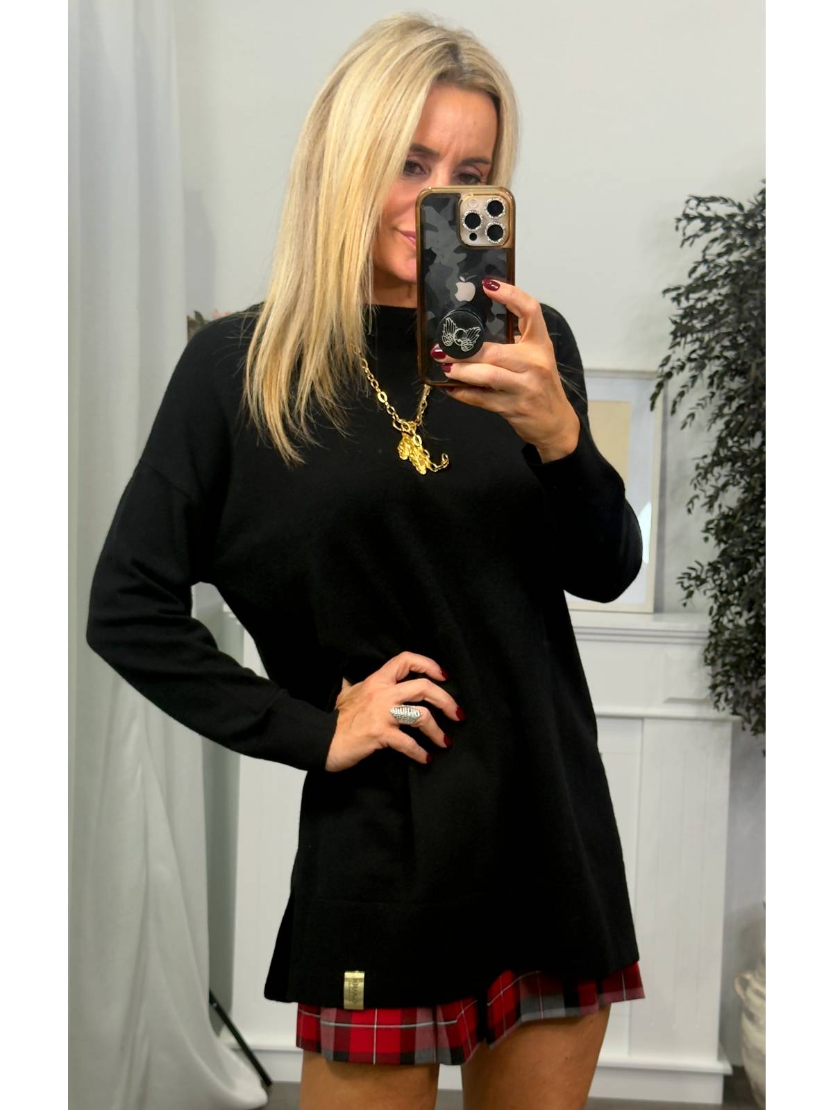 Jersey de punto negro oversize, con cuello redondo. Detalle punto trenzado en centro frontal. Canalé en cuello, mangas y bajo. Pequeña abertura en bajo laterales.