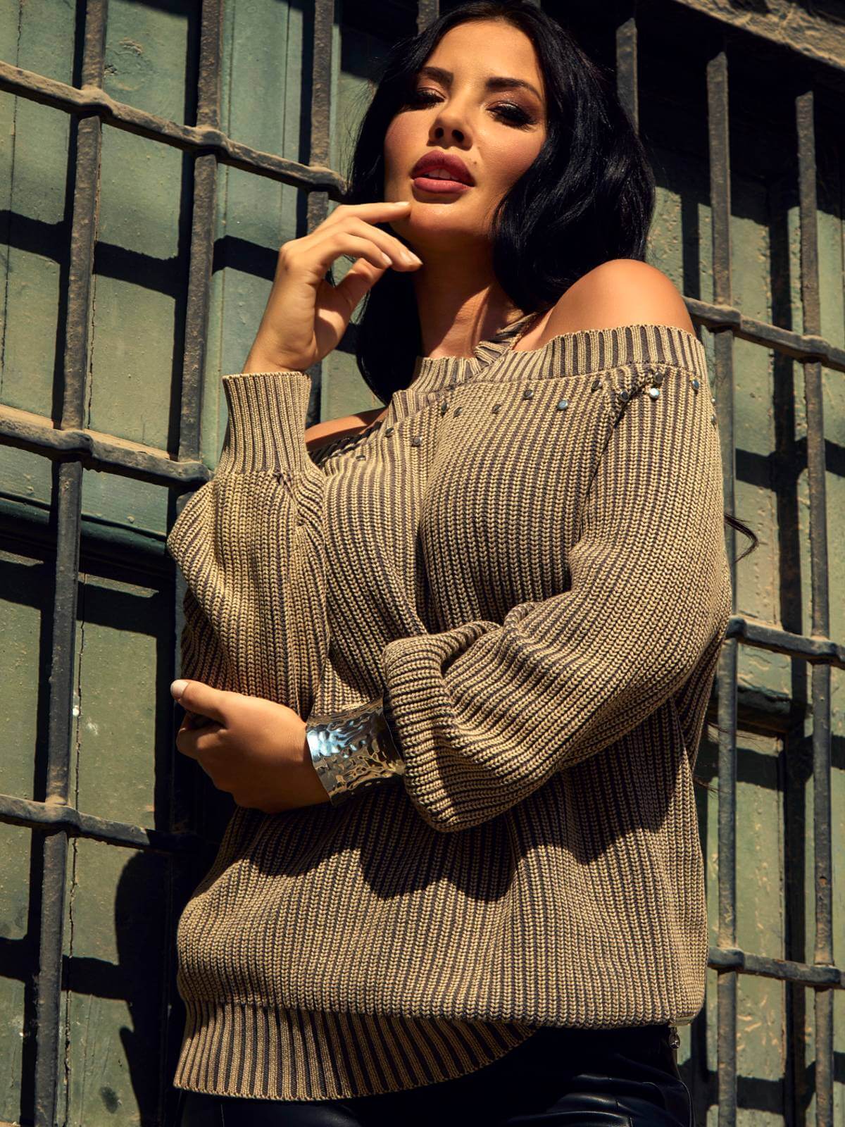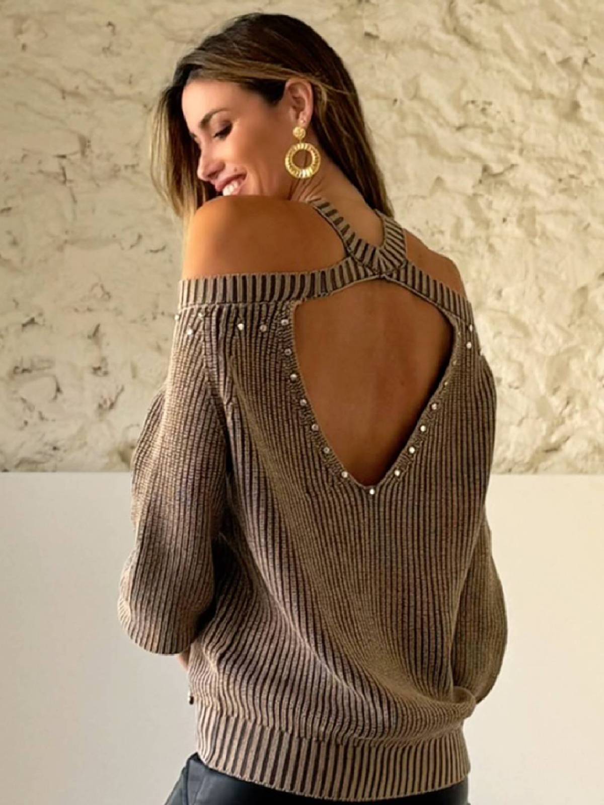Jersey de punto oversize cut out taupe atado al cuello, hombros y espalda descubierto con detalles de tachuelas en plata.