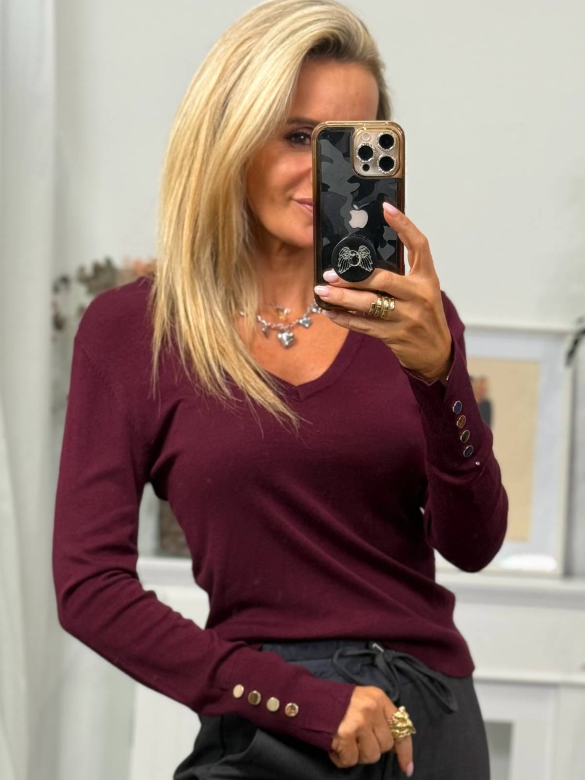 Jersey de manga larga, cuello en V y detalle de botones en manga. Composición: 73% viscosa, 27% poliester.