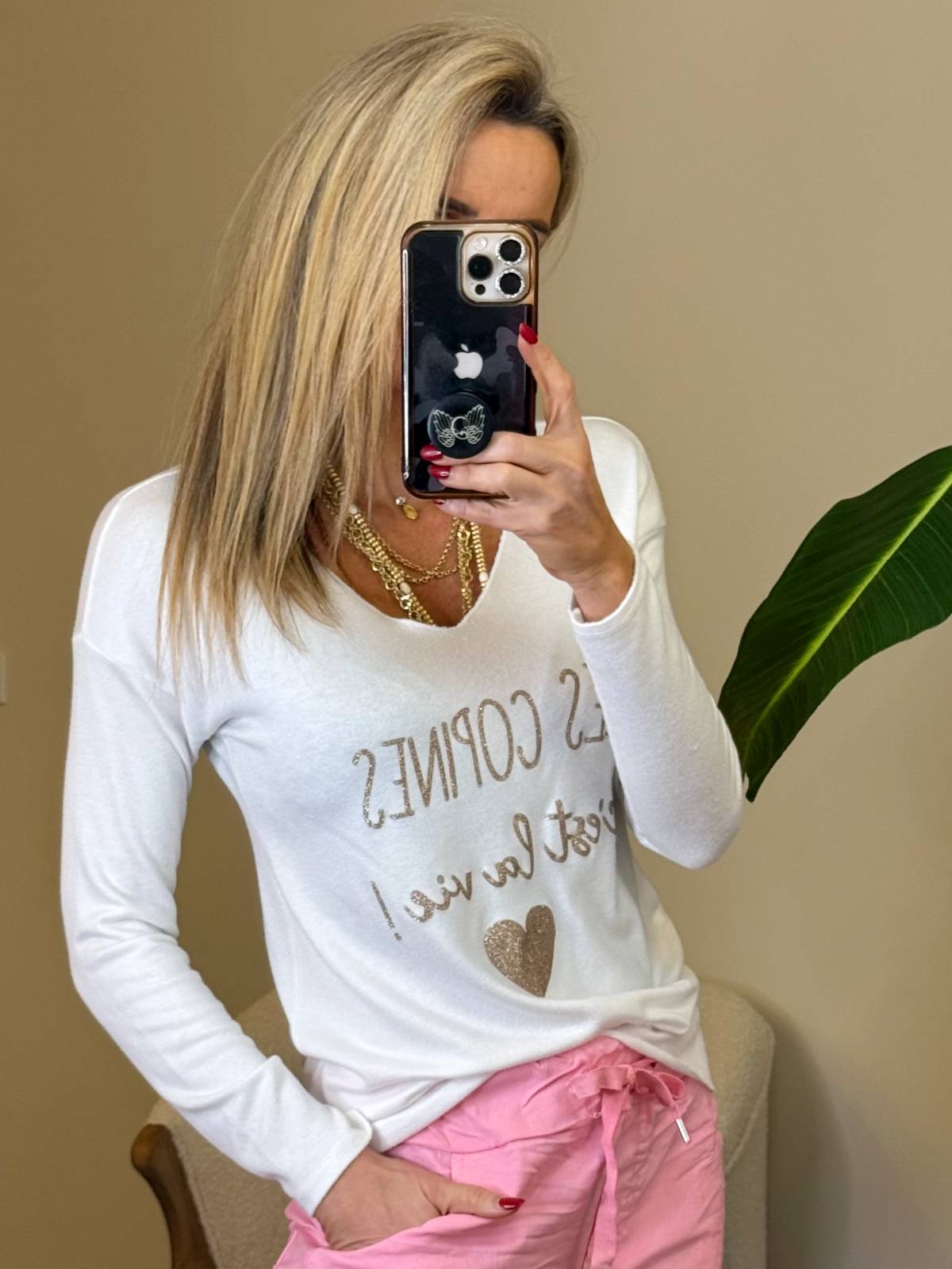 Jersey de punto fino de manga larga con esocte en pico con estampado con frase con detalle de purpurina. Composición: 80% viscosa, 15% nylon, 5% PBT.