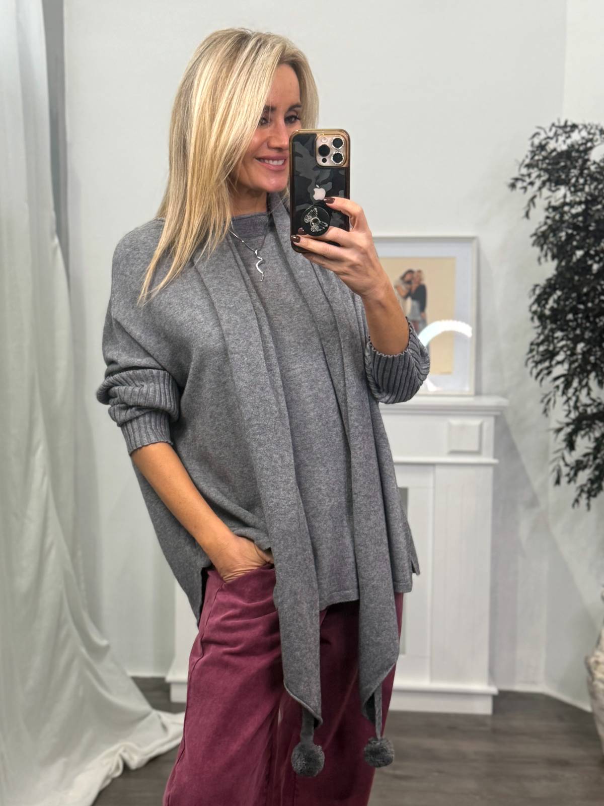 Jersey oversize de punto con cuello de barco, manga murciélago con detalle de canalé- Detalle de bufanda del mismo color. Composición: 35% modal, 25% viscosa, 20% nylon, 15% poliéster, 5% lana.